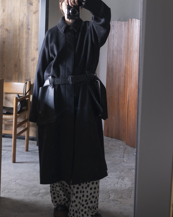 レザーを使用したベルトとポケットパーツは革を専門とする鞄の腕の良い職人さんに手作業で仕立ててもらっています。生地は縦横共にカシミヤ混でウール原料もスーパー100‘S原料を使ったリッチな糸を使用。 綾二重の接結リバーで締まり感のあるショート ビーバーが適度な反発感をもたらします。カシミヤの光沢や上質感を感じられる組織となっています。
