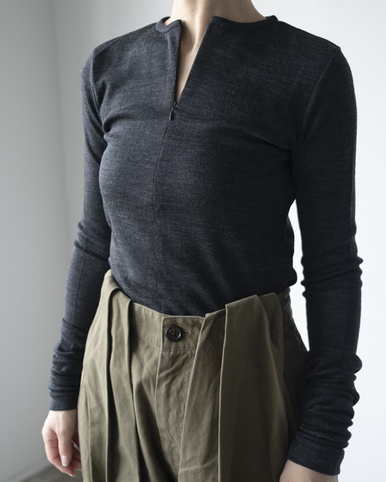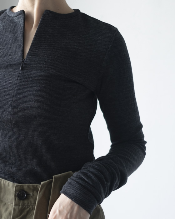 タイトフィットなサイズ感で長い袖をくしゅくしゅと袖にため、シンプルですが遊びのあるデザイン。フロントのコンシールファスナー開きが、首元をすっきり見せてくれます。