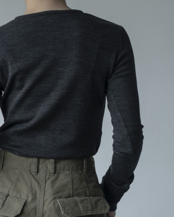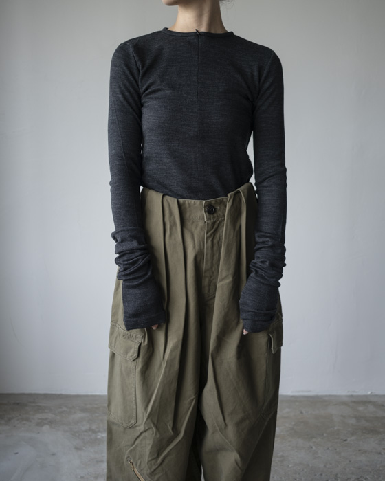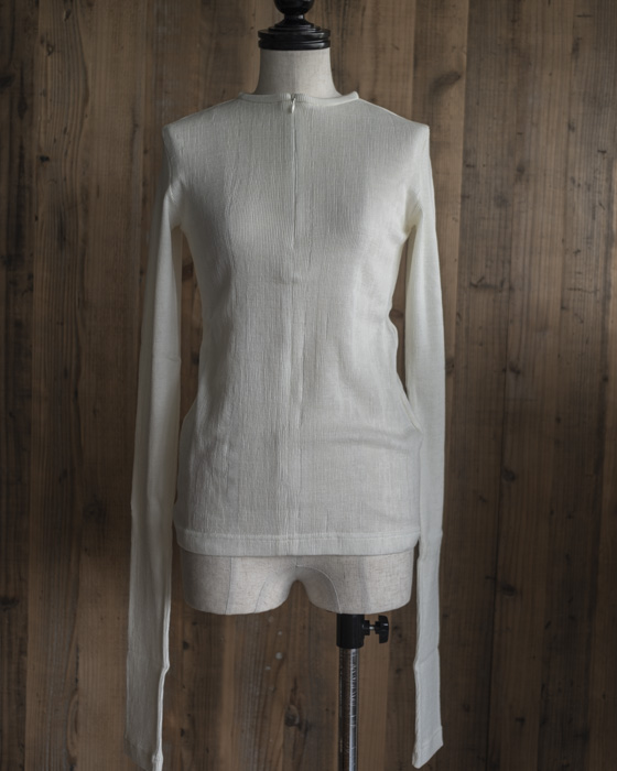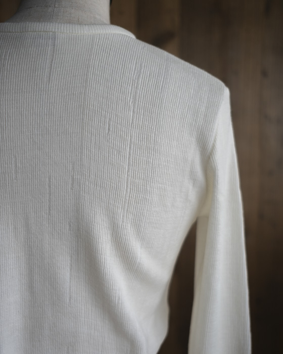 素材は、オーストラリア産のファインメリノウールを使用したプレーティングテレコ素材。あえてランダムに目を落とし、ダメージのように編み立てました。仕上げ工程で特殊なタンブラー乾燥をし、ふっくら柔らかな肌触りに仕上げています。