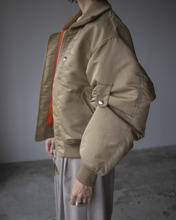 胸元や背面、サイドのポケットディテール、袖口・裾のリブ仕様など、機能性とデザイン性を兼ね備えたディテールが満載。袖のアームタブで表情を変えられるのもポイント。