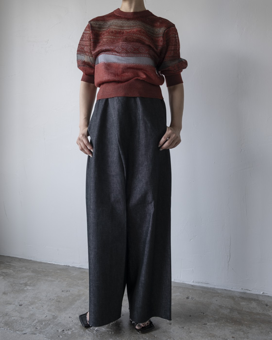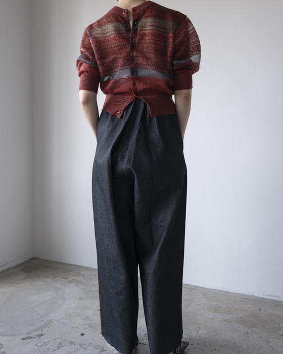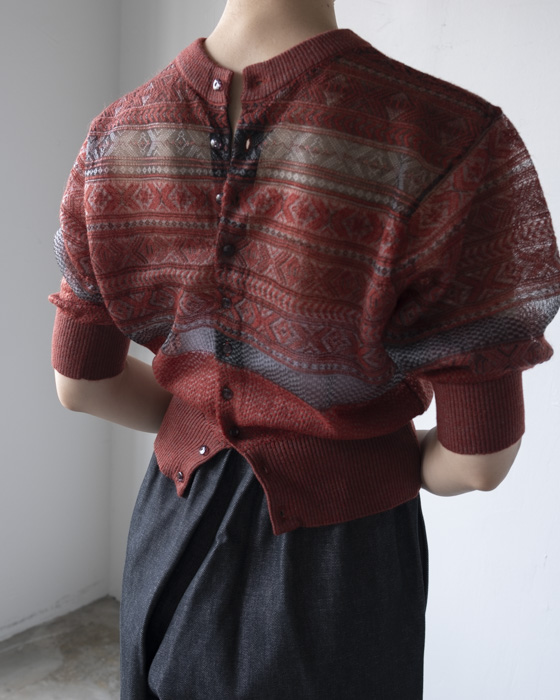 短丈でコンパクトなサイズ感と、透け感のある素材がトラディショナルなフェアアイル柄をモードに女性らしい印象に