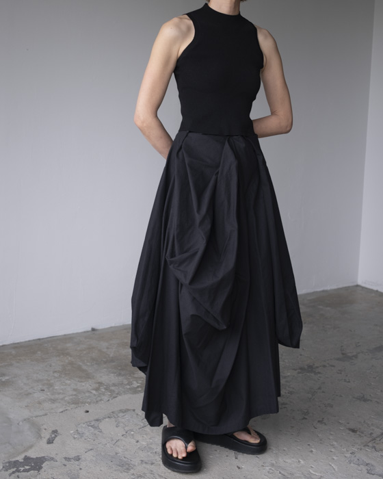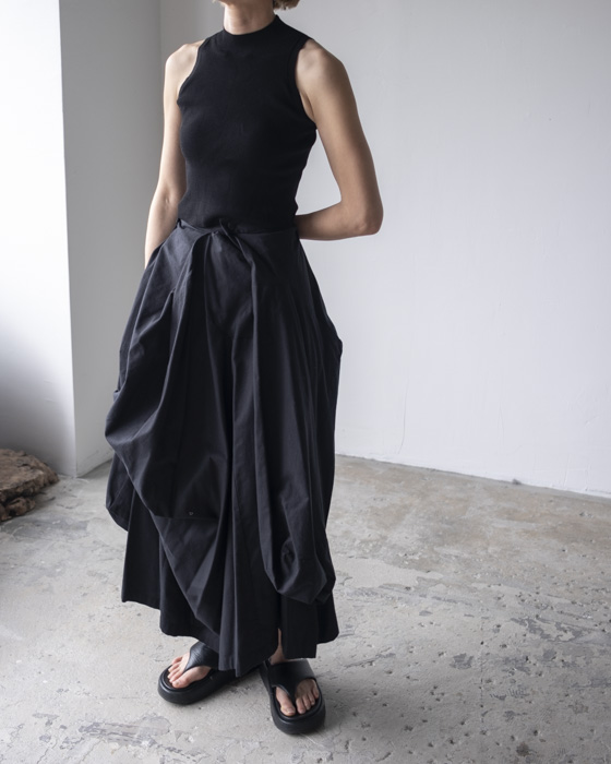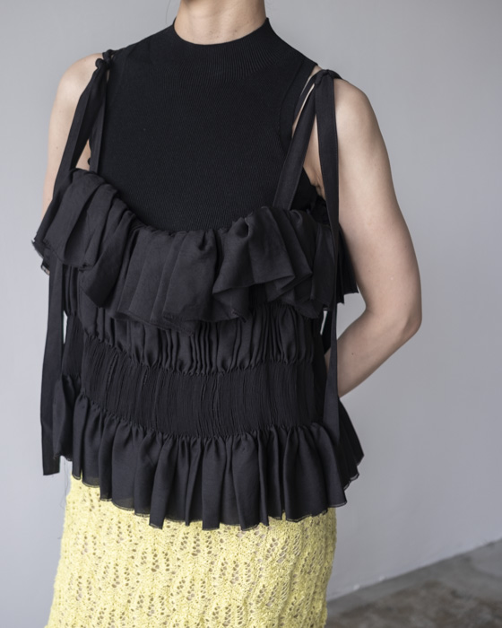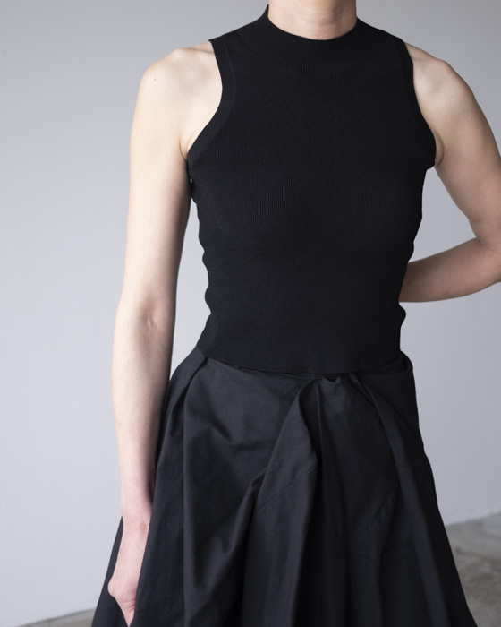 ホールガーメントによるシームレスで編み立てたアメリカンスリーブクロップドトップス。