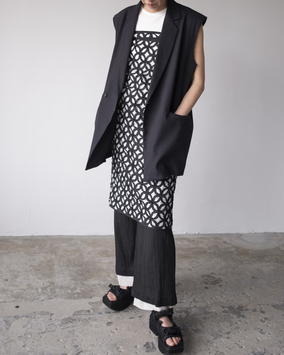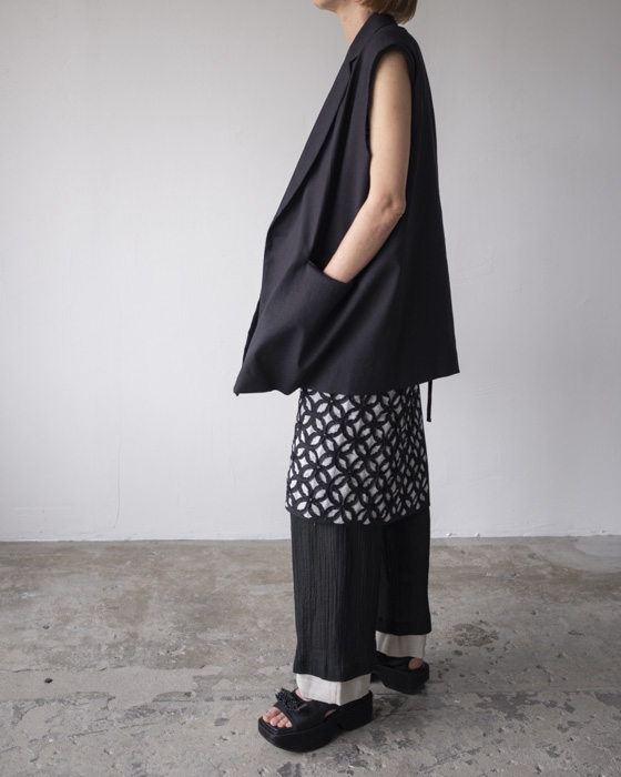 素材は、リネンに特殊な芯をボンディングした素材はリネンの特有の風合いは残しつつもシワにならないようにハリがある、クールさを演出。