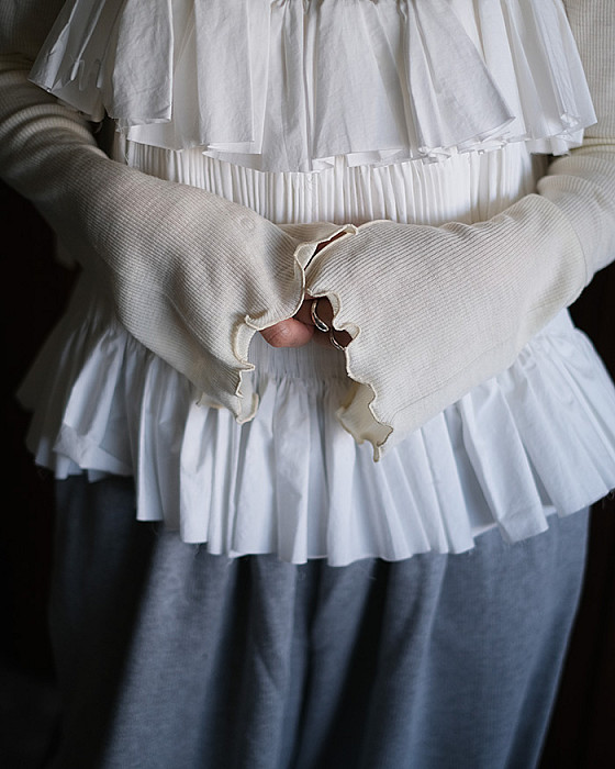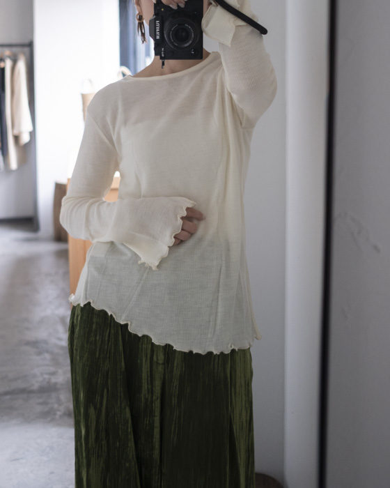 WOOLは細番手ウール糸を使用し、使いやすい薄手の肉感とキメ細糸を甘撚りにし斜行を極力少なくした素材です。