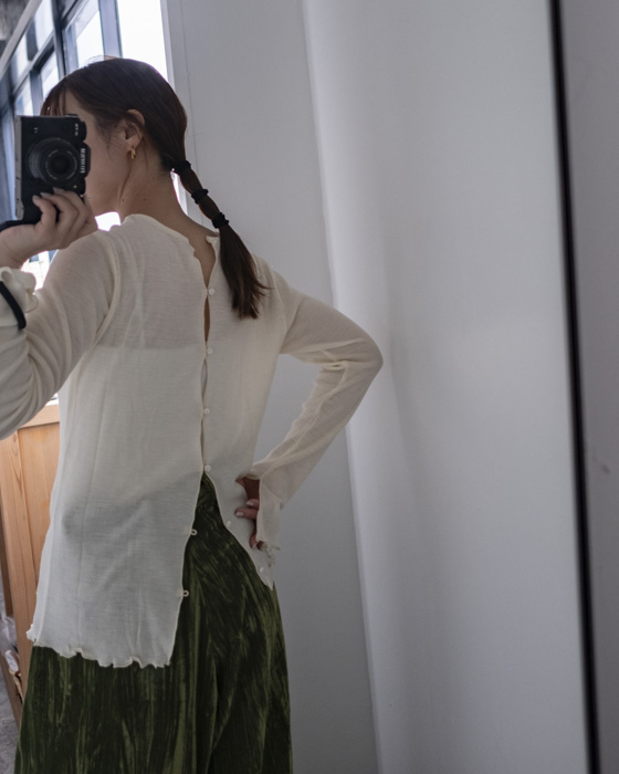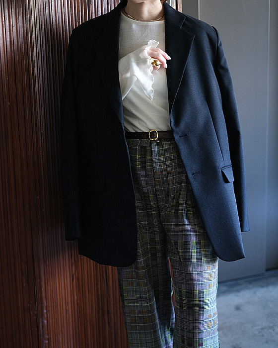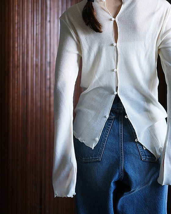 ほど良くフィットするシルエットにアシンメトリーな丈でバランスがとりやすく、羽織りとしてはもちろん、ボタンを全て留めてプルオーバーのように着こなすのもおすすめ◎
