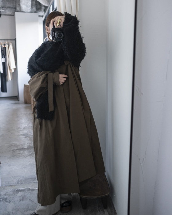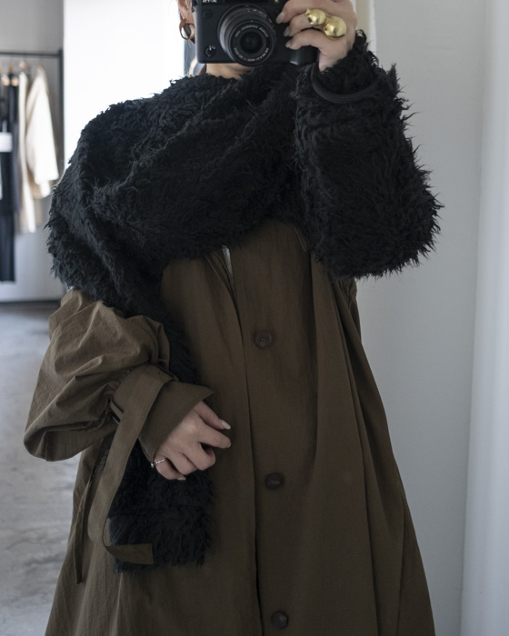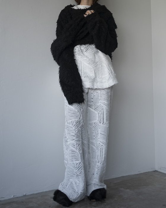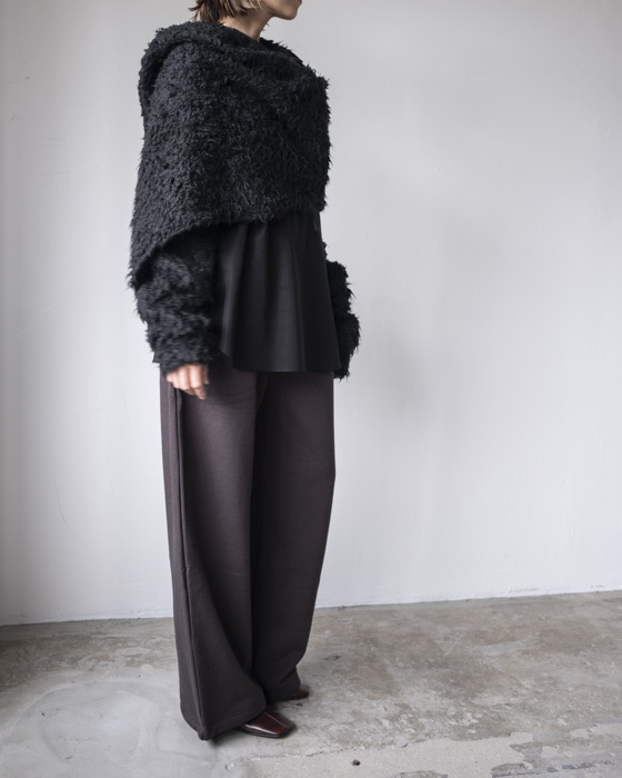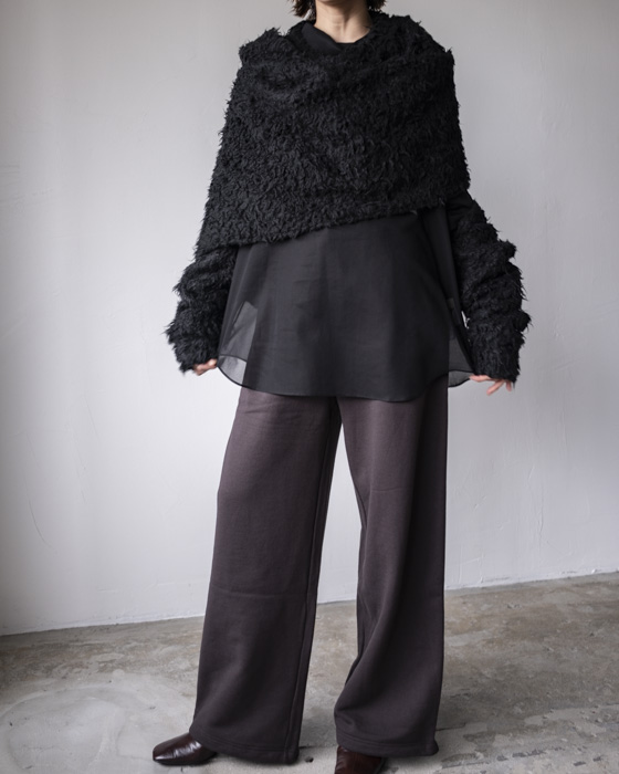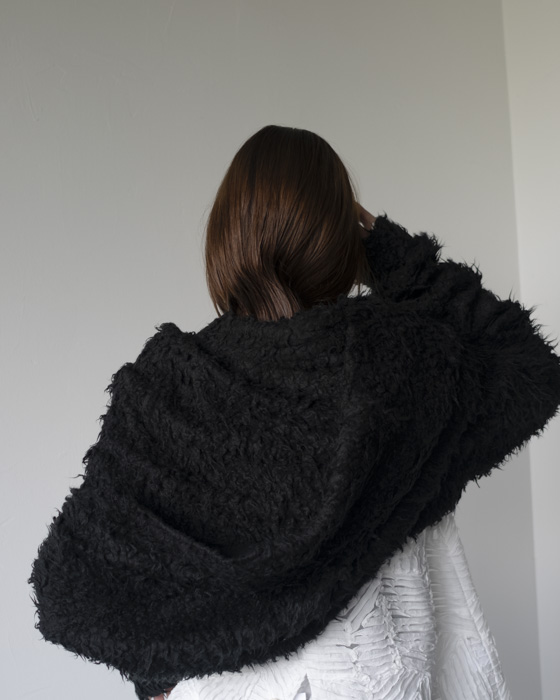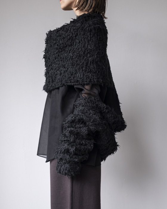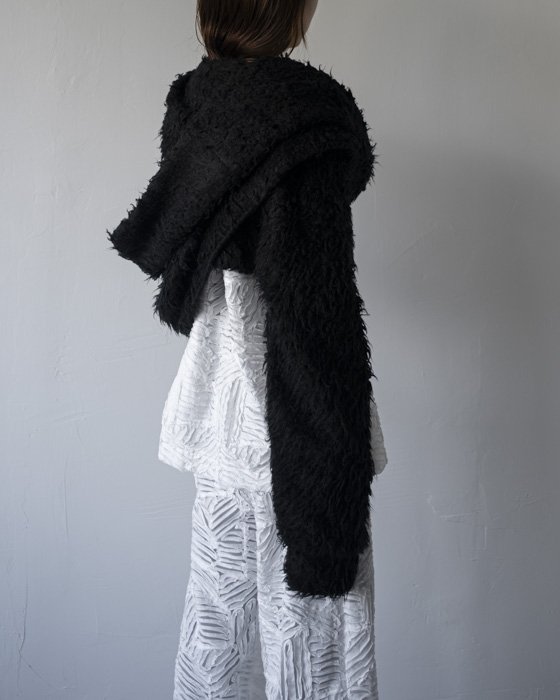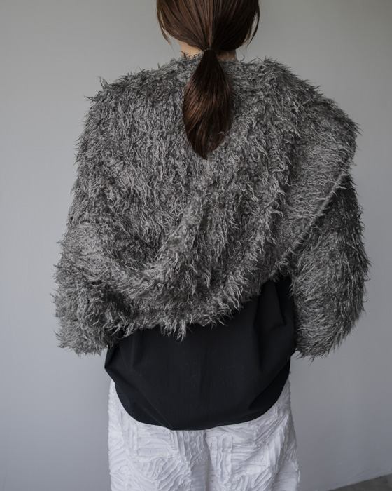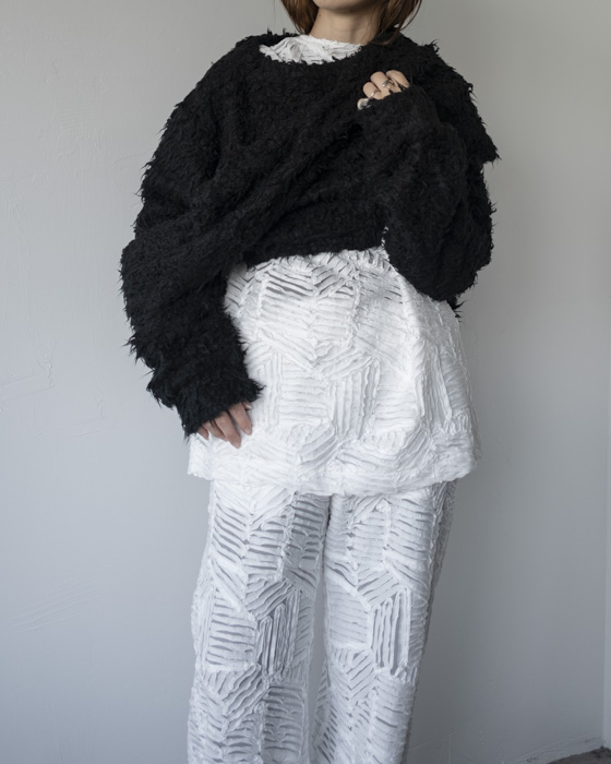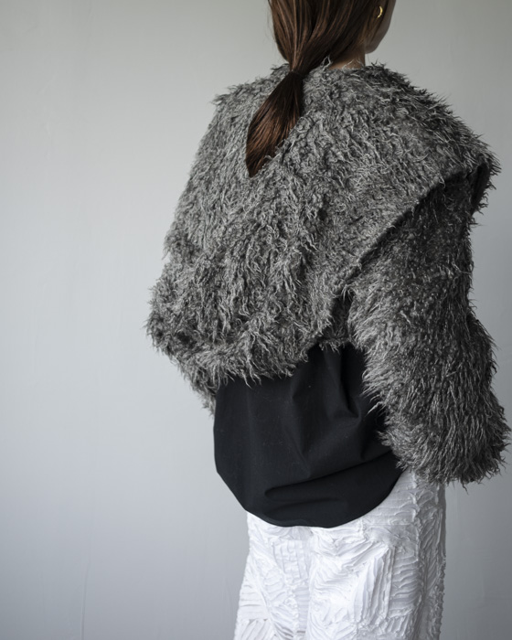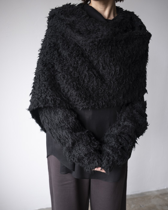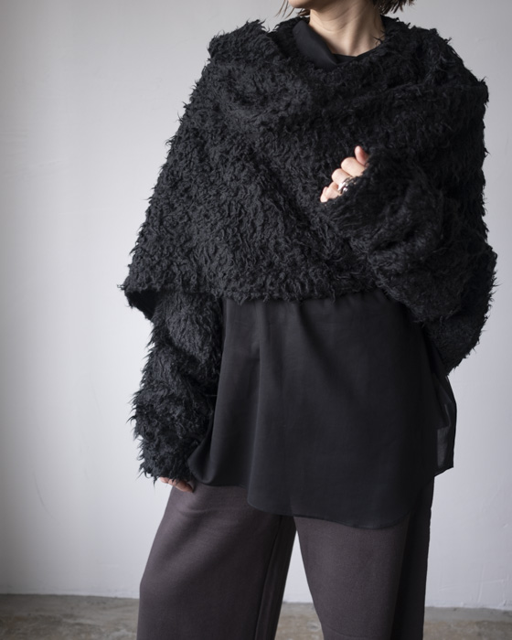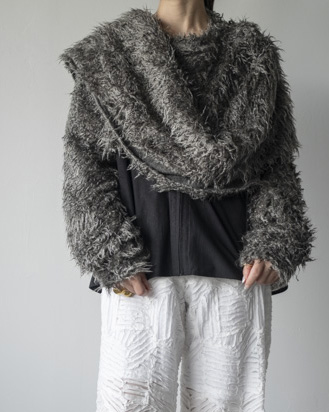 ストゥーピッドなデザインのシャギートップス。一見すると左袖が非現実的な長さのシャギートップスですが、その長さを利用し、マフラーのように首周りにまわし、左袖に通せるようなデザインとなっております。究極にシンプルかつ合理的なデザインに落とし込みました。