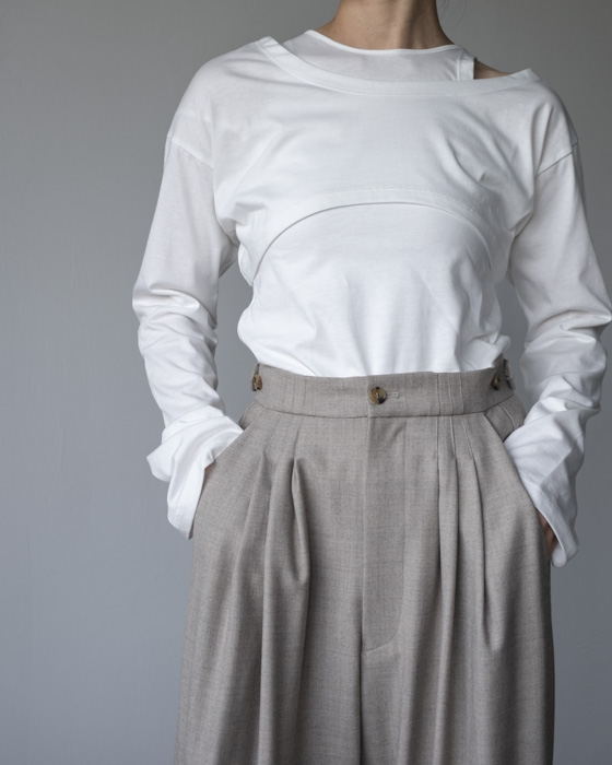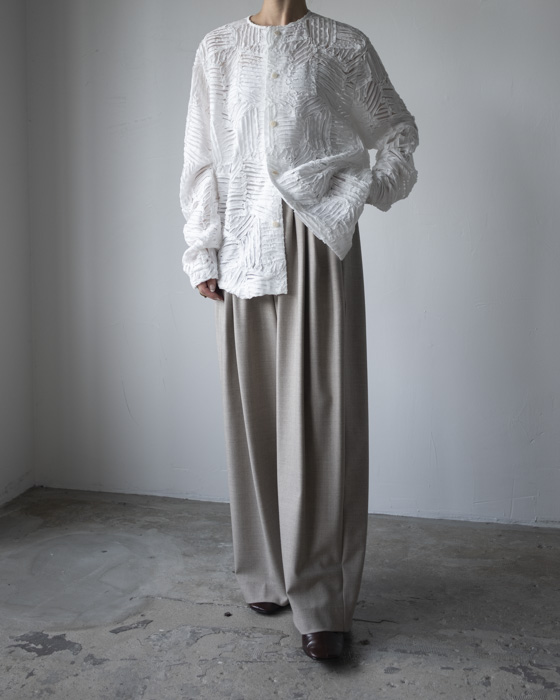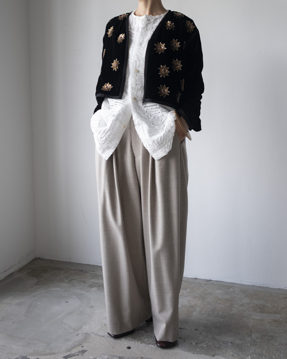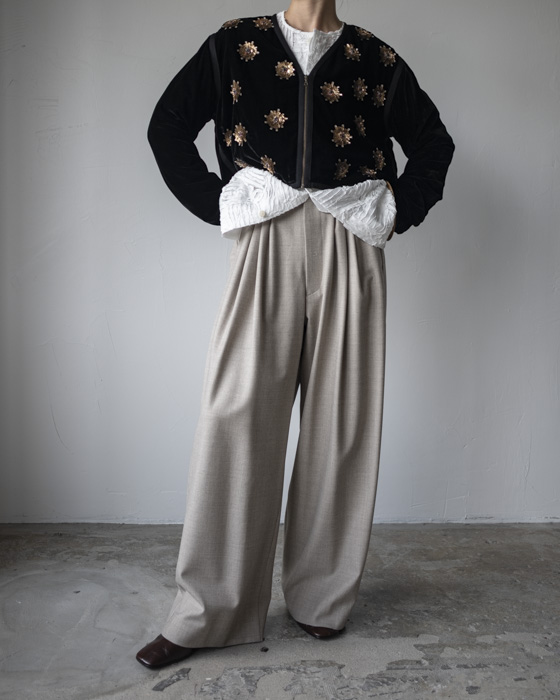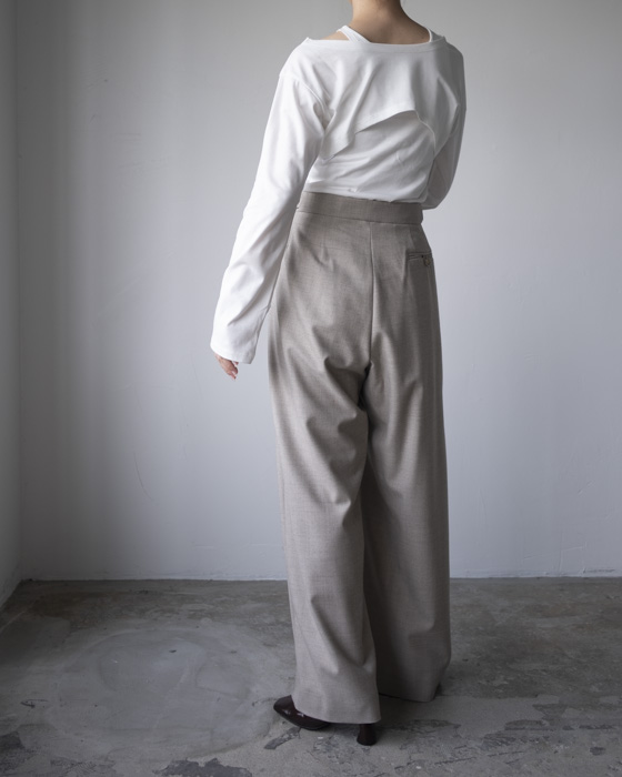 同シルエットのチノ素材も落ち感が同様にありますが、こちらはさらに滑らかでウール素材ならではの軽い温もりがあります