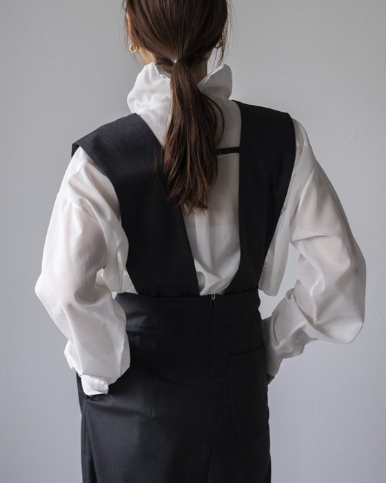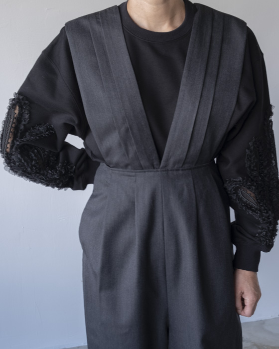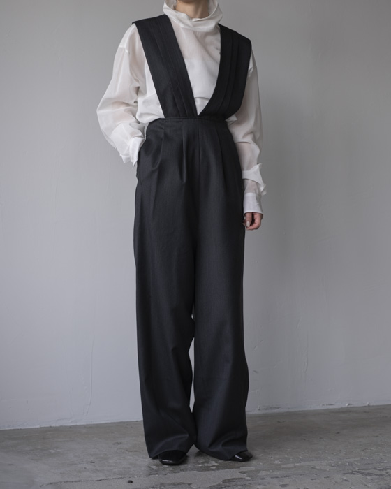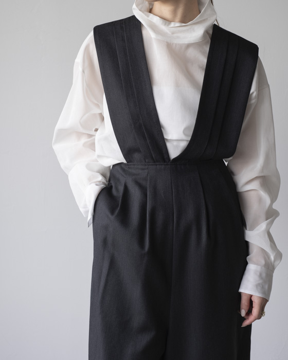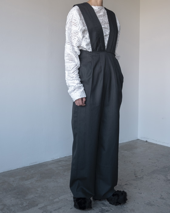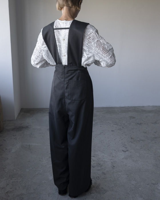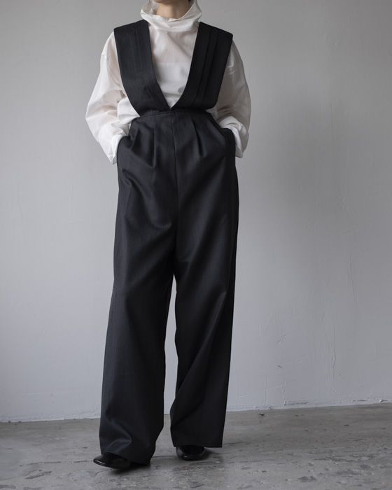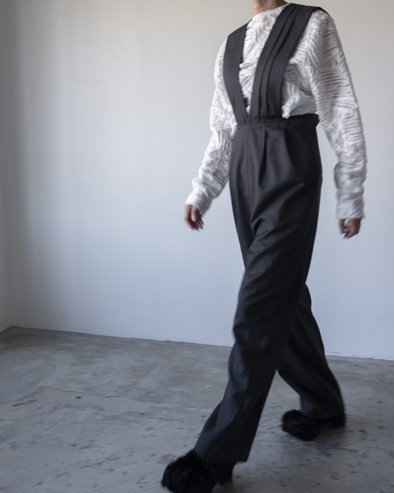 タスキをかけたようなストラップデザインが目を惹くパンツ。股上の深いシルエットが自然なスタイルアップを叶えます。ストラップの下部にはボタンがあるので長さ調節が可能。組み合わせるインナーよってカジュアルにもフォーマルにも着回せるアイテムです。