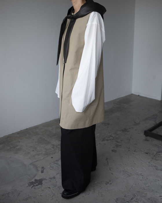 前タテは、上質なフェイクレザー。さりげなくフロントを開けたときに見える異素材コンビが◎