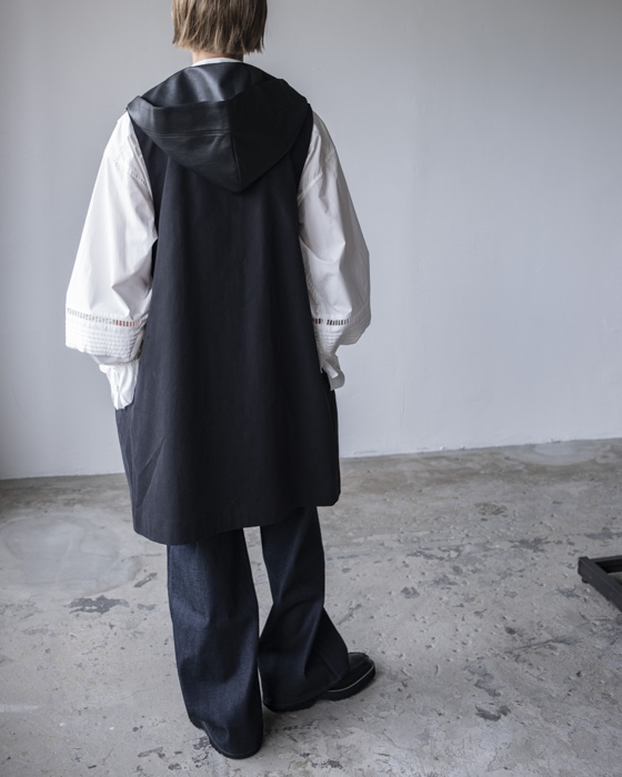 前タテは、上質なフェイクレザー。さりげなくフロントを開けたときに見える異素材コンビが◎