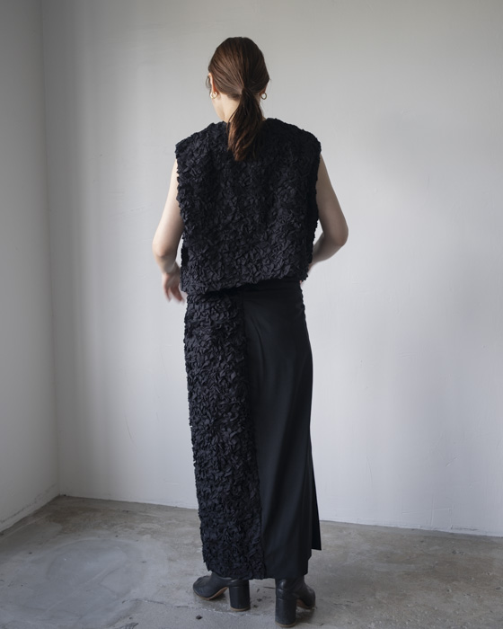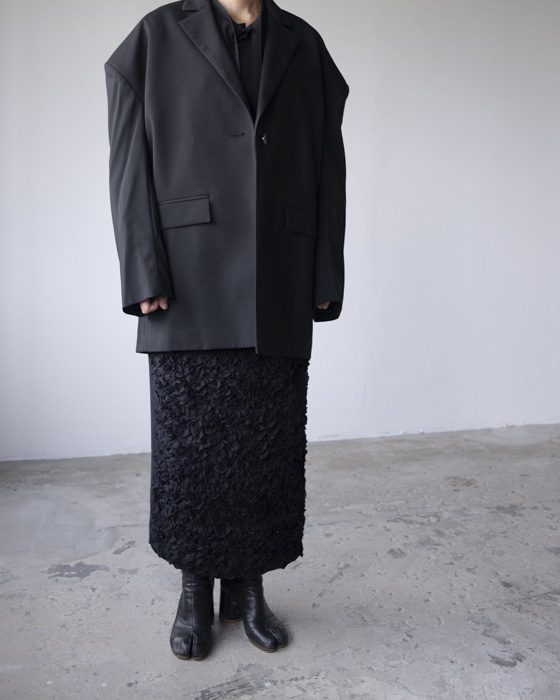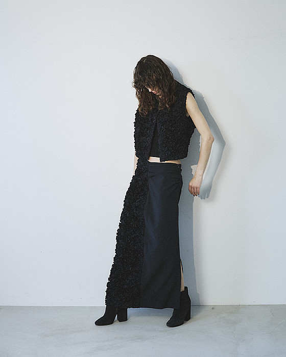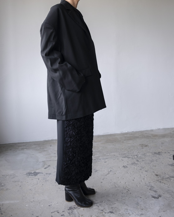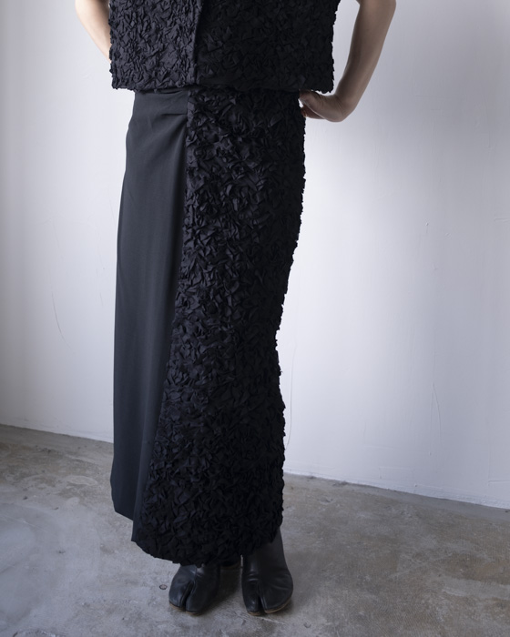 お花の花びらが敷き詰められたような程よい立体的なボリュームの刺繍とウールサキソニーがコンビになったスカート。