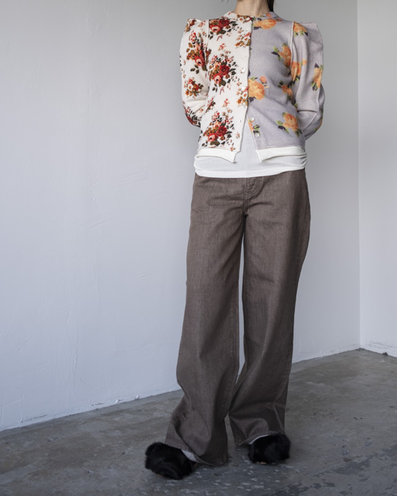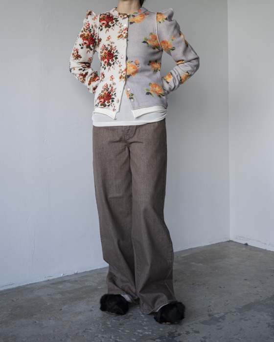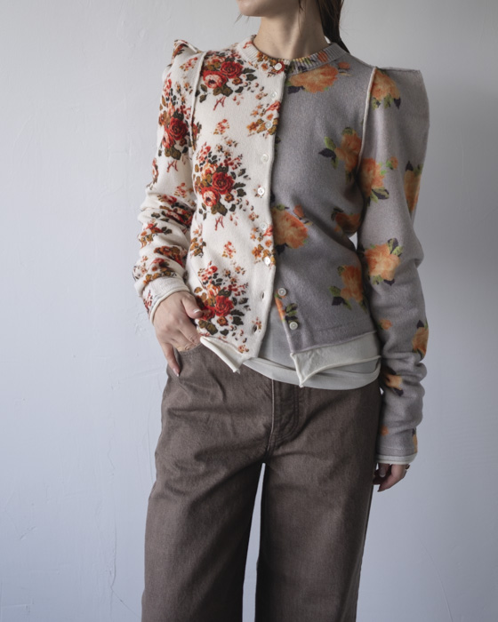 アシンメトリーなフラワープリントカーディガン。ウール100%の柔らかな素材にプリントを施し。さらに起毛加工を加えることでヴィンテージ感ある雰囲気に。