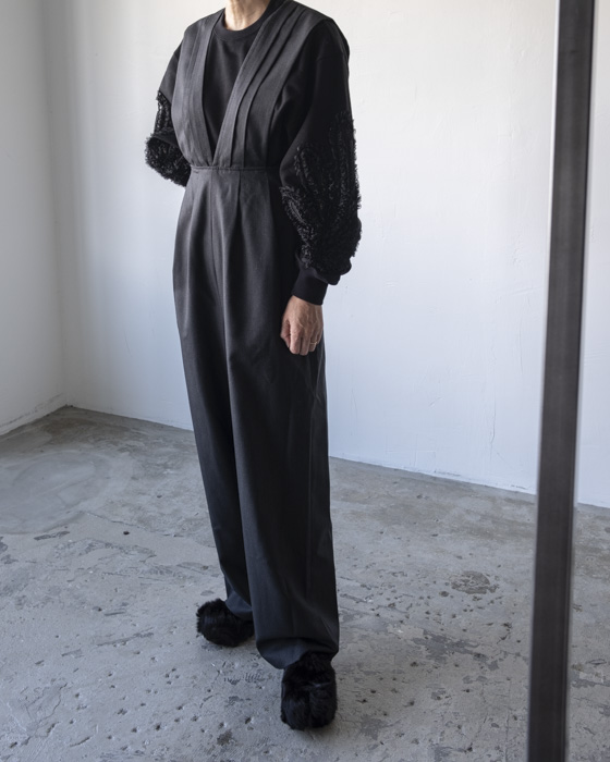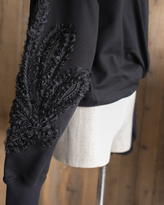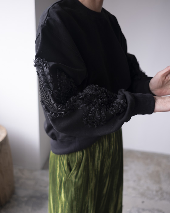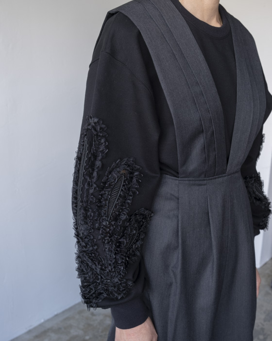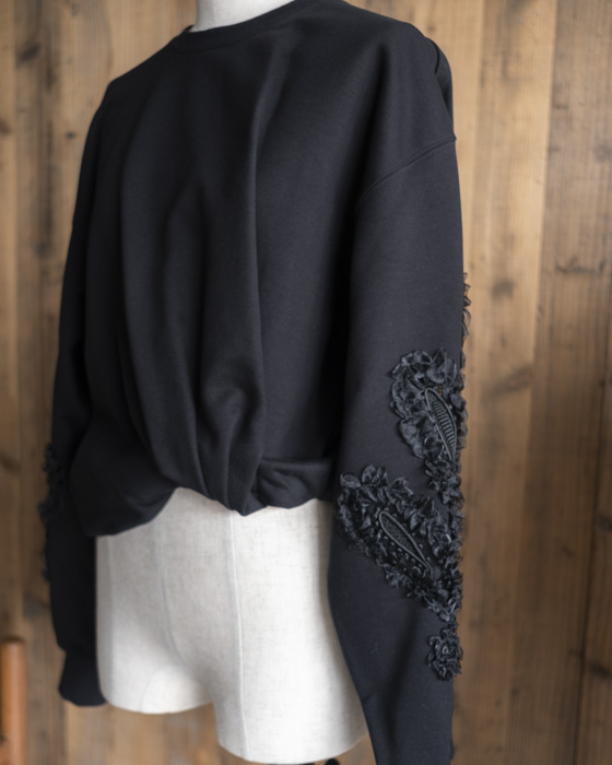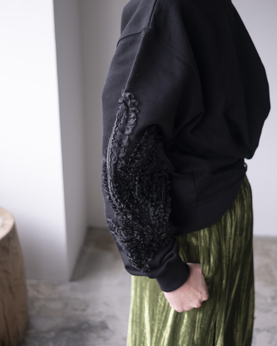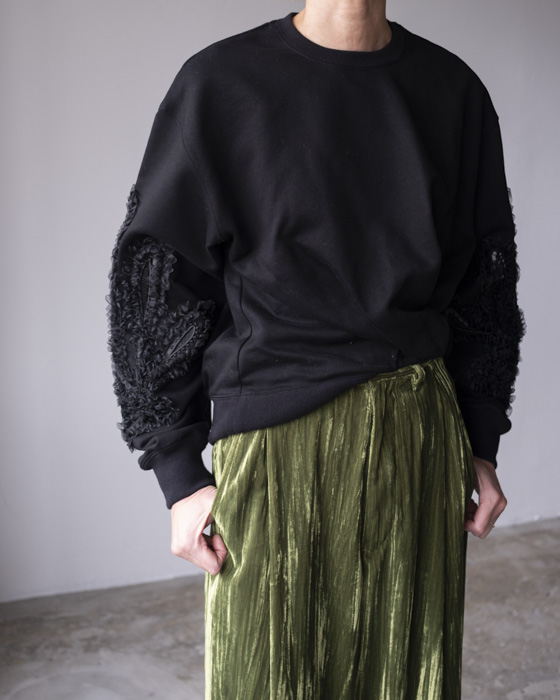 TELMA(テルマ)のカットソー。ベーシックなスウェットをベースに、袖に施された刺繍レースが華やかさを添える一枚です。フロント裾は、まるでボトムスにインしたかのように織り込まれたデザインで、自然な立体感とこなれた雰囲気を演出。クルーネックのシンプルな首元が顔周りをすっきりと見せ、カジュアルからフェミニンまで幅広いスタイリングにマッチします。