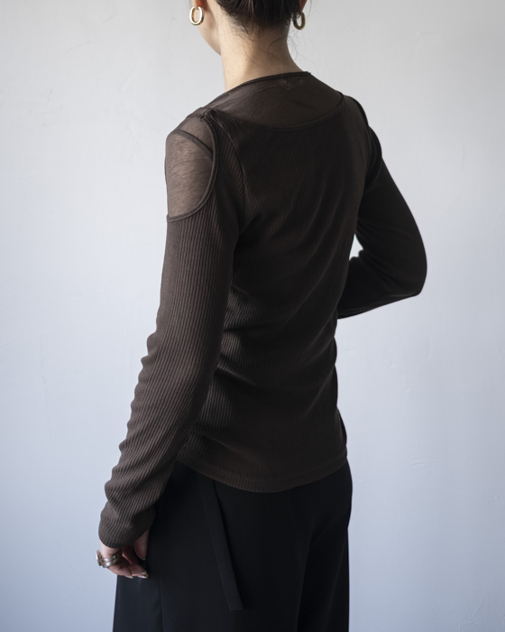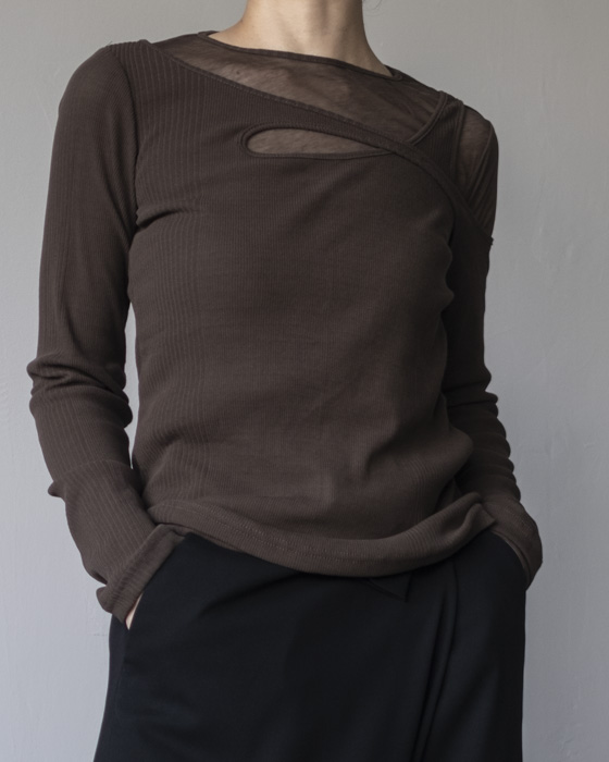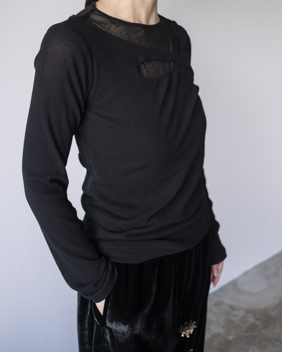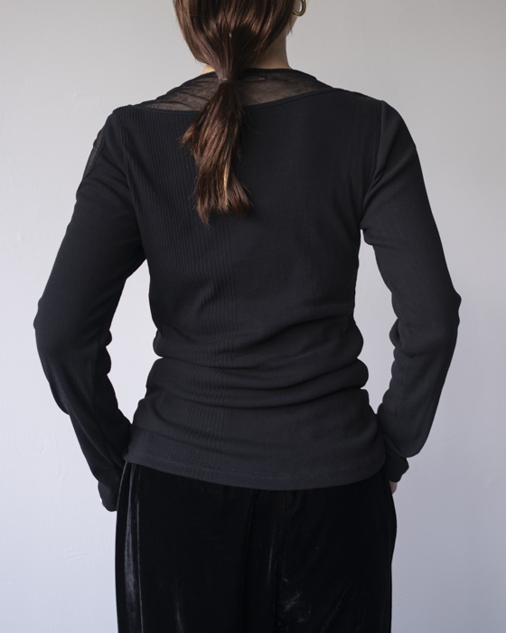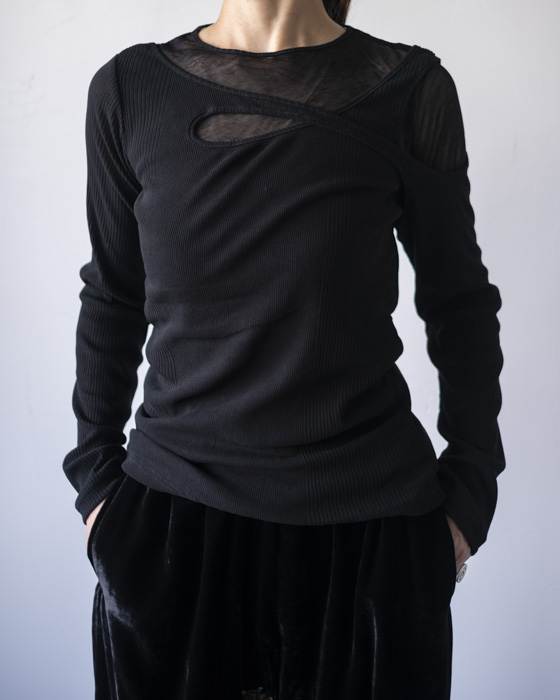 80/1プレミアムスーピマを極限まで強撚した糸で織り上げた、希少なシアー素材を使用したトップス。