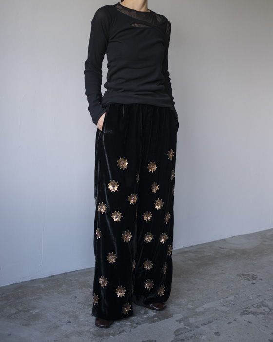 古い織機で時間をかけて織られた生地は、独特の透明感とドライな質感を持ち、針抜きのテクスチャーが奥行きのあるレイヤー感を演出します。