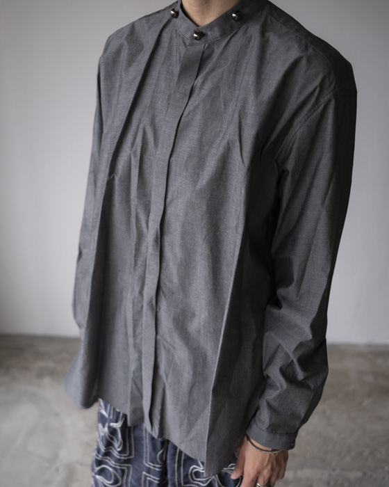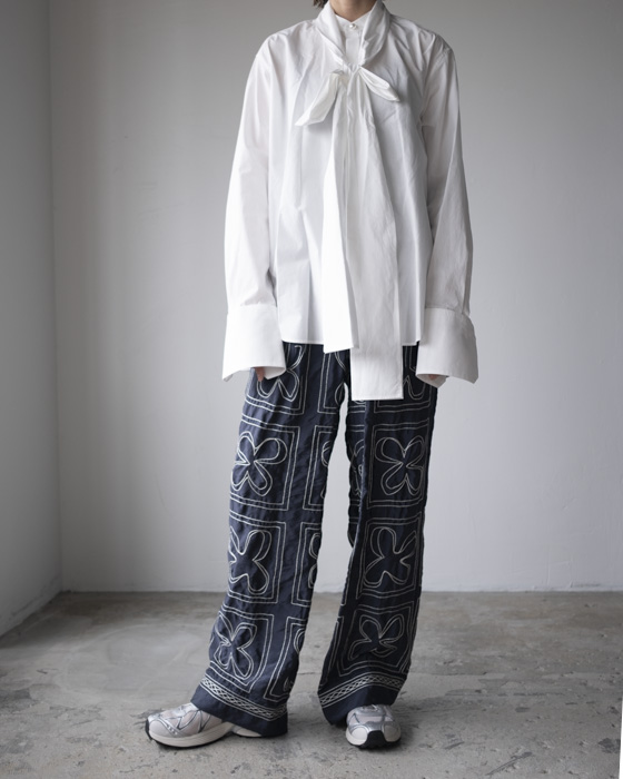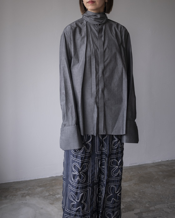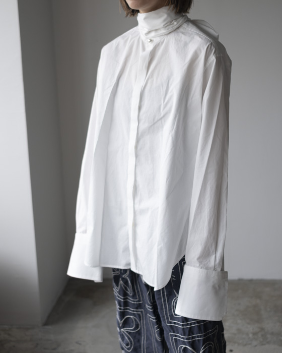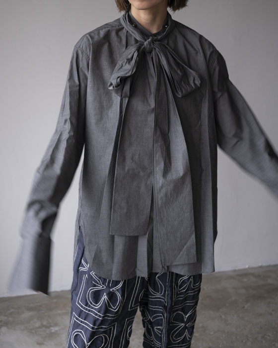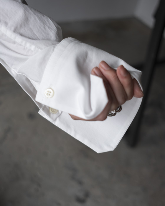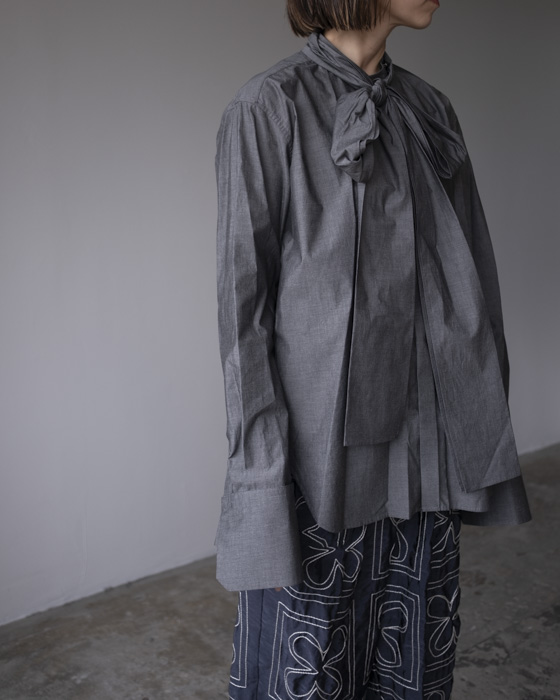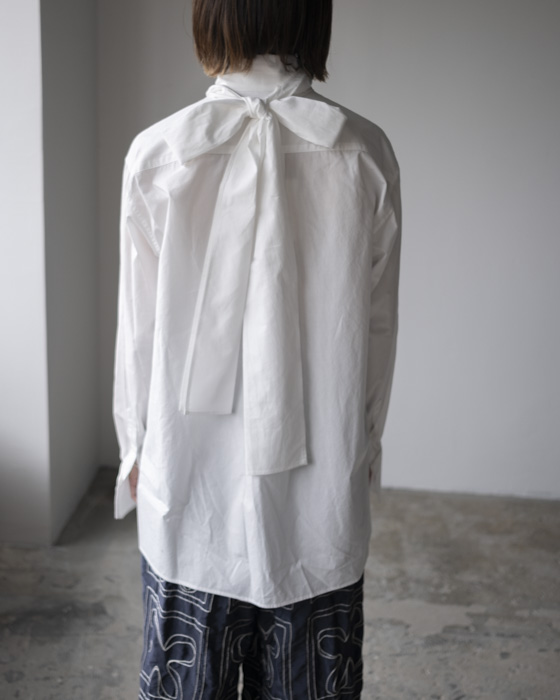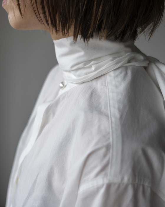オーガニックコットン100% の上質な素材に、繊細なシワ加工を施し、ナチュラルな奥行きと表情をプラス。 小さな洗い機で少量ずつ丁寧に揉み洗うことで生まれる、計算された小じわと凹凸感が、ヴィンテージライクな風合いを引き出します。 ボウタイは取り外し可能。前後どちらでも着用できる2WAYデザイン。 前で結べばクラシカルに、後ろに流せばモードに。さらに、カフスとボウタイを外せば、洗練されたバンドカラーシャツへと変化。 シルエットの美しさと自由な着こなしが共存する、タイムレスでコンテンポラリーな一着。