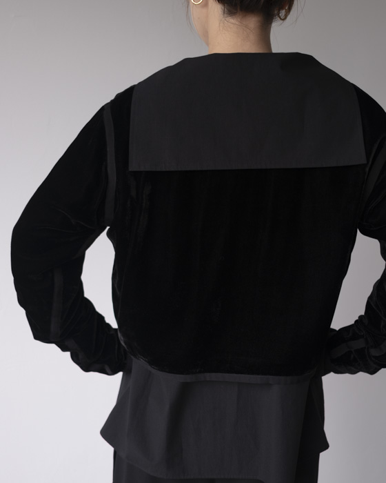 難しいと思われがちなセーラーカラーをフロントからはセーラーカラーにみえないさり気なさ、バックスタイルのセーラーカラーも少しコンパクトに甘すぎないデザイン設計。