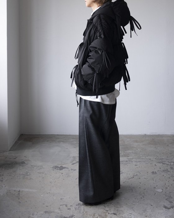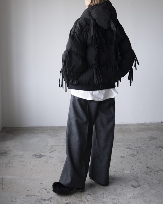 テープ状のリボンを散りばめていて、フードを被った時のBack Styleが個性的であり美しいポイントです。