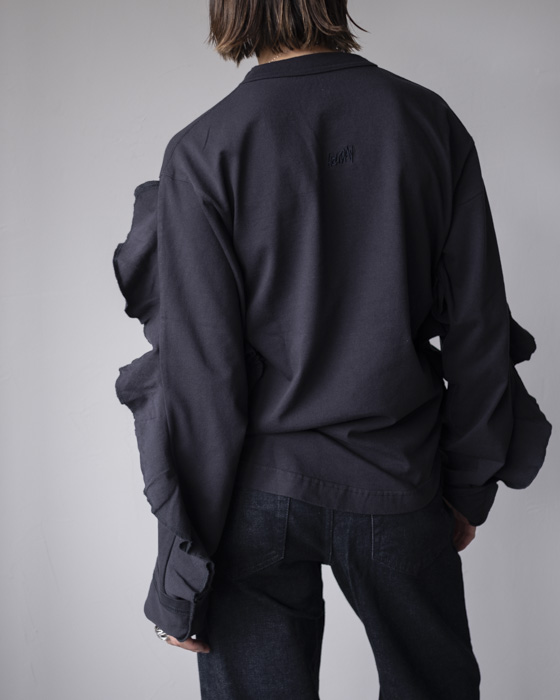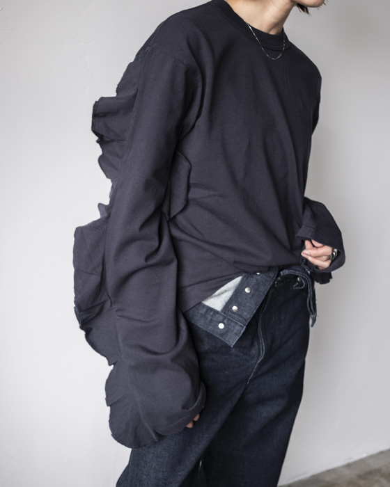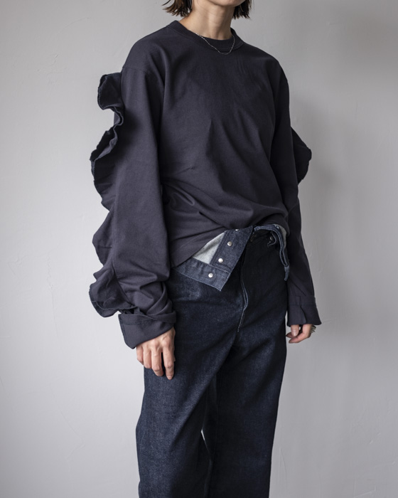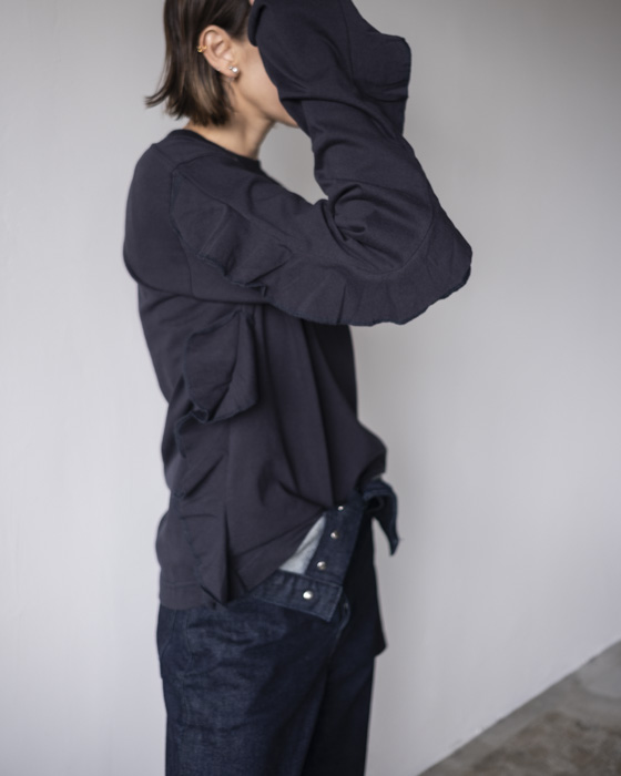 ヘビーオンスでドライな質感が特徴の【SUPER FINE DRY】L/S TOPS。スリーブとサイドにフリルをあしらった遊び心あるデザイン。首元はクラシックなバインダーネック仕様。バックにロゴ刺繍入り。