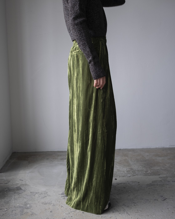 メゾンも使用するこちらのベロアは、国内ではクラッシュの入ったような織り方は珍しく、素材そのものに存在感があり、エレガントになりやすいベロアも独特の色出しされた、深い程よい鮮やかさのあるグリーンが魅力◎