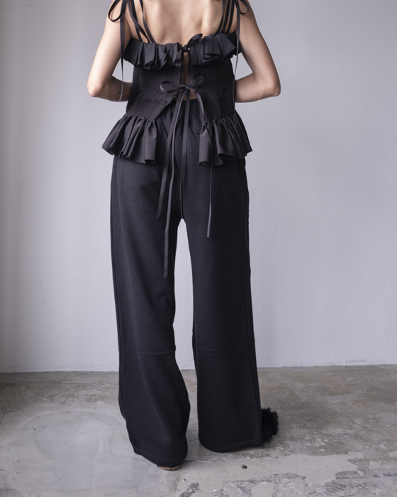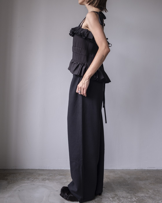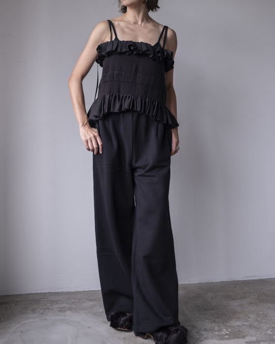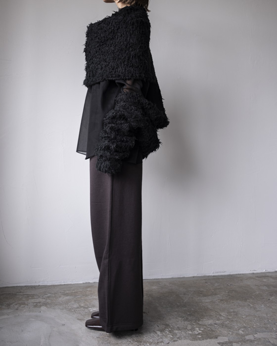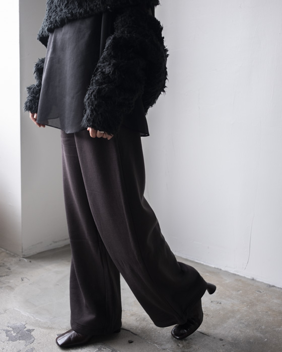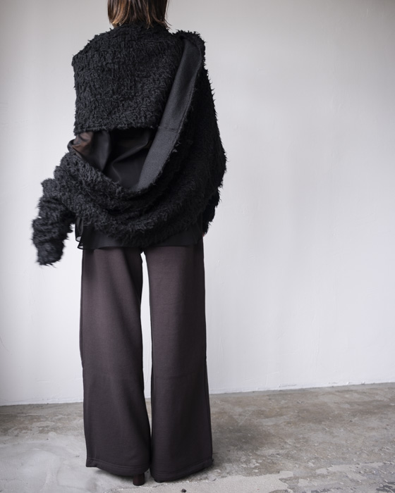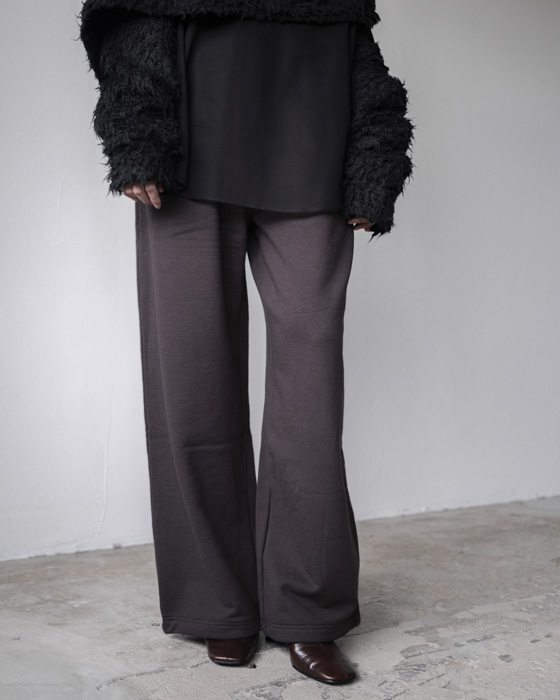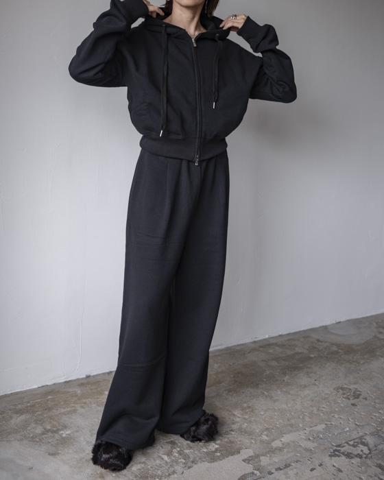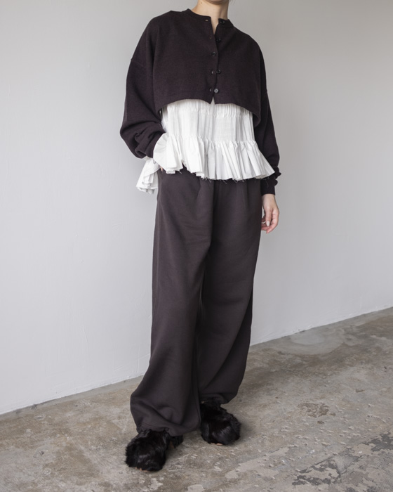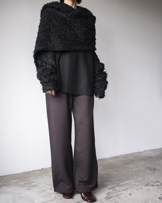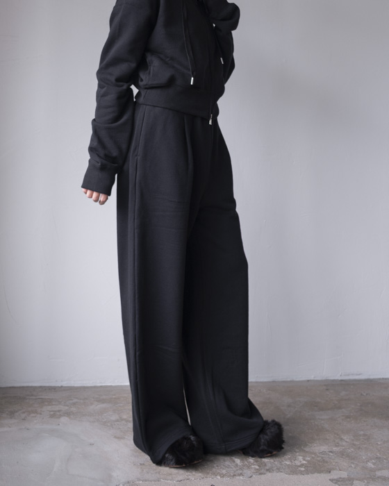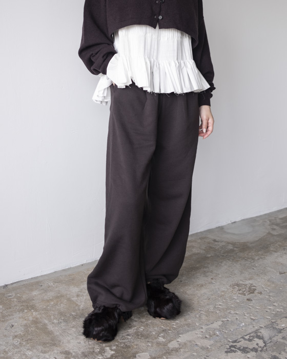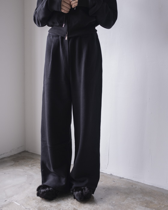 タックを入れ、スラックスライクなデザインにしたワイドスェットパンツ。コットンウールの膨らみと落ち感が程よいドレープを出してくれます。裾を絞って着用も可能。