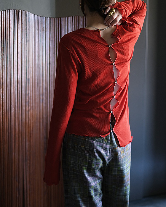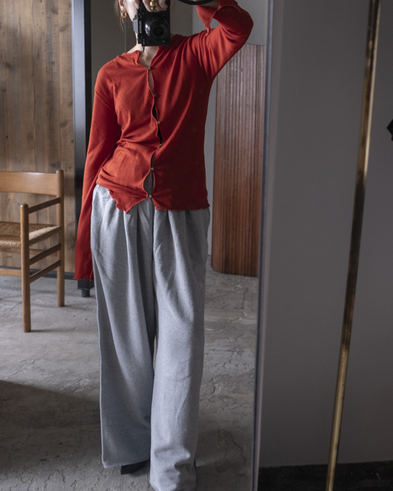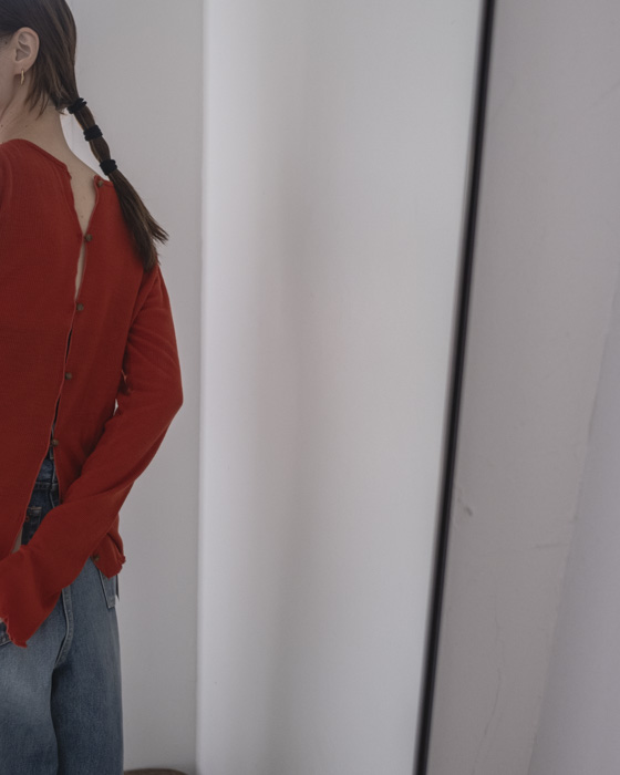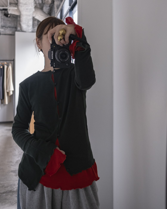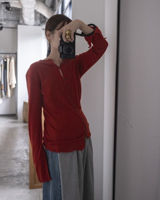ほど良くフィットするシルエットにアシンメトリーな丈でバランスがとりやすく、羽織りとしてはもちろん、ボタンを全て留めてプルオーバーのように着こなすのもおすすめ◎