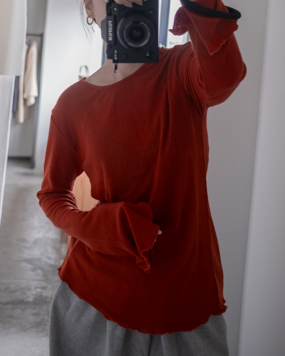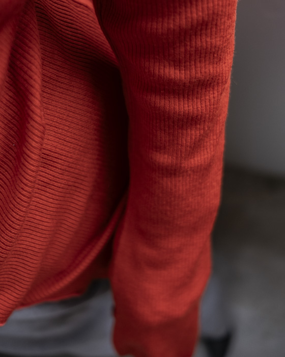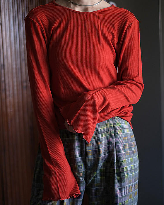 WOOLは細番手ウール糸を使用し、使いやすい薄手の肉感とキメ細糸を甘撚りにし斜行を極力少なくした素材です。