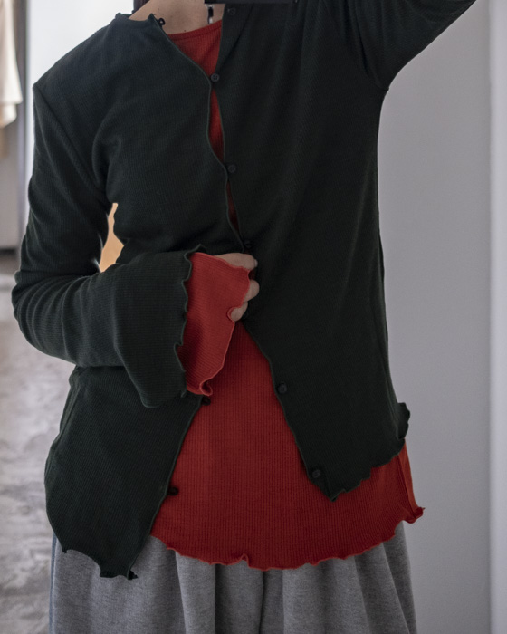 ほど良くフィットするシルエットにアシンメトリーな丈でバランスがとりやすく、羽織りとしてはもちろん、ボタンを全て留めてプルオーバーのように着こなすのもおすすめ◎