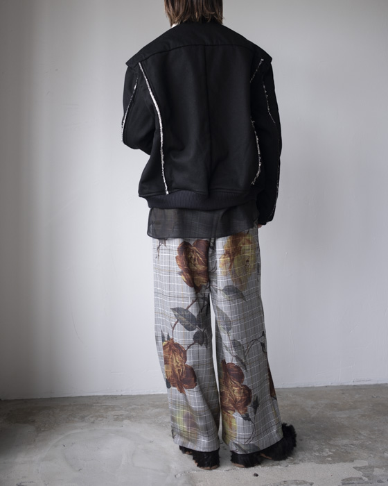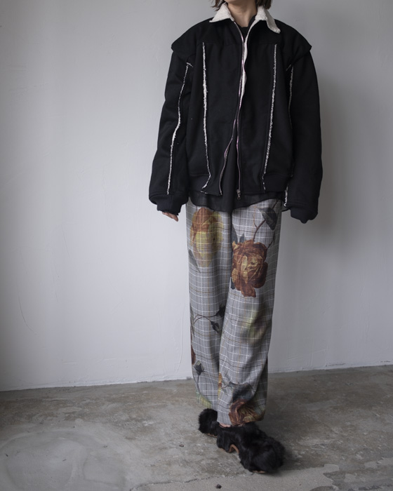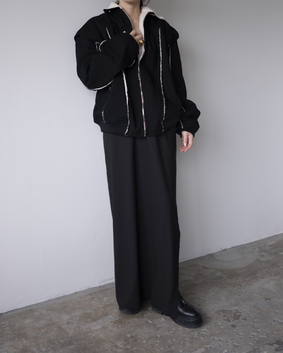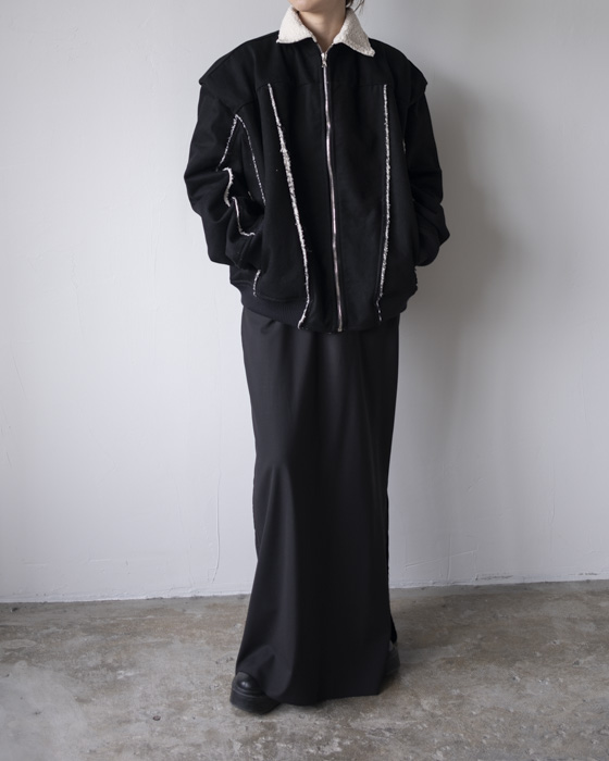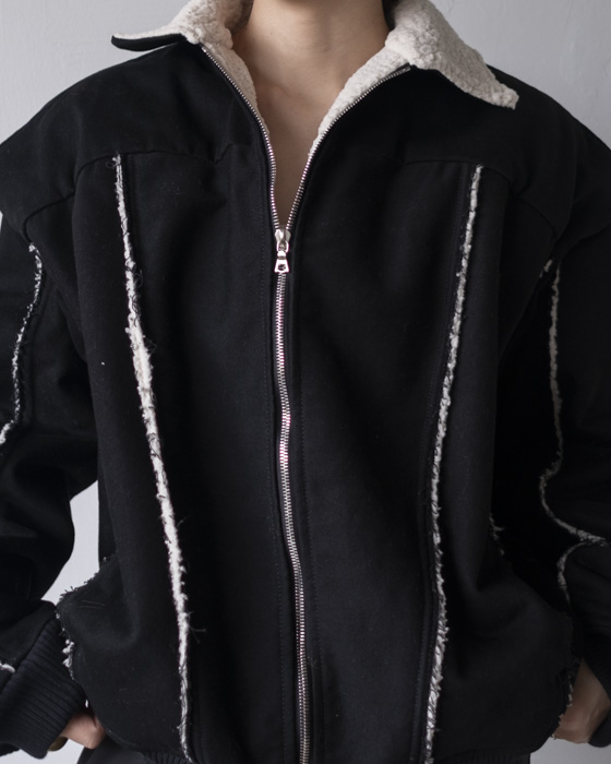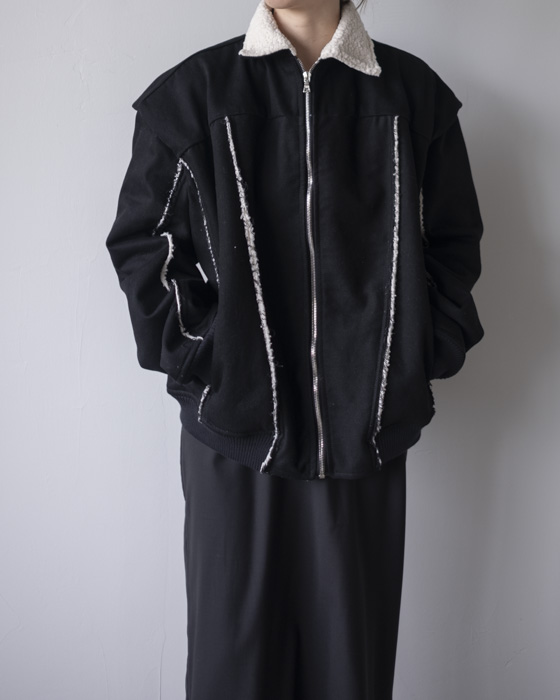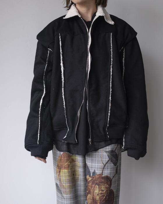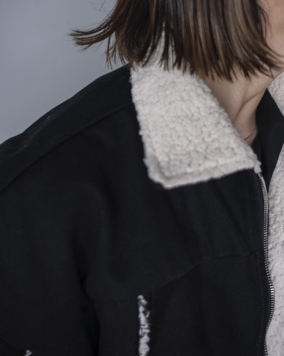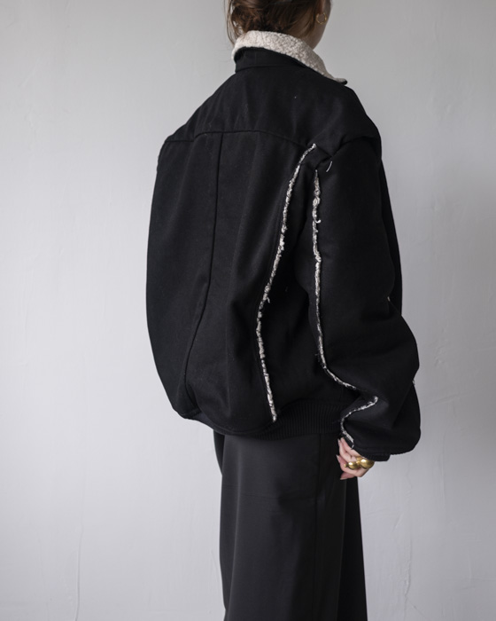 シェルパの裏地をあしらったデニム ボンバージャケット。ゆったりとしたシルエットで中に着込めるサイジング