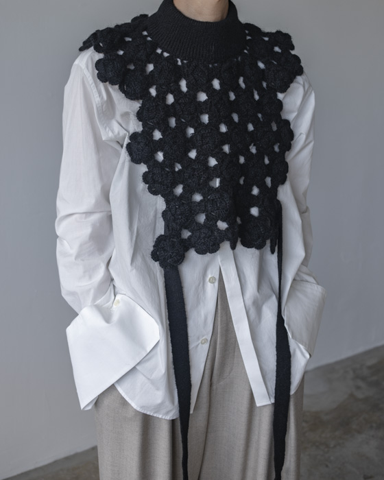 立体的なローズモチーフが視線を奪い、ミニマルなインナーに重ねるだけで主役級の存在感を放ちます。