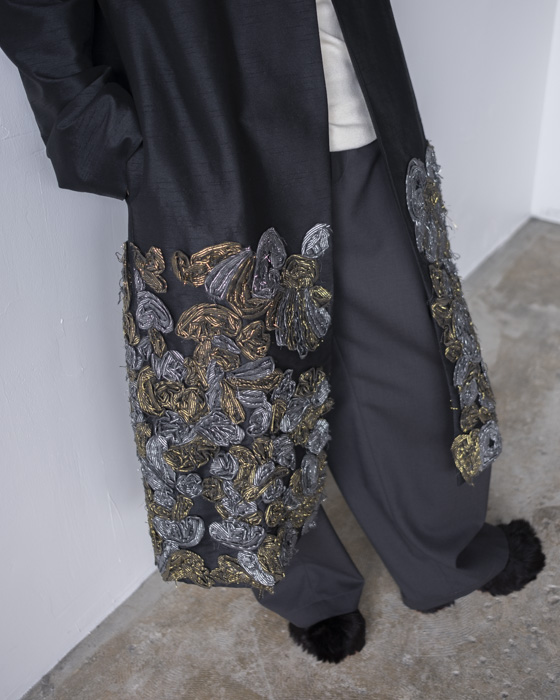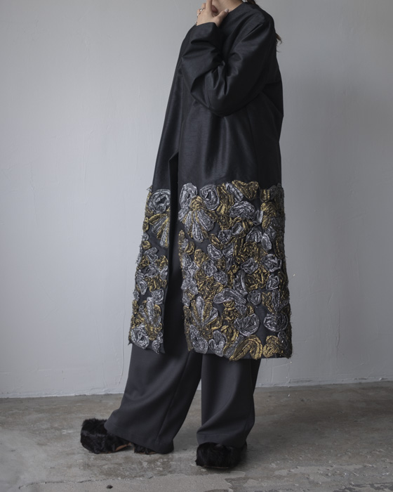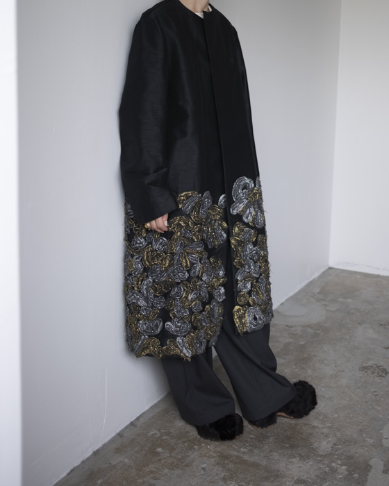 インドのトップブランドが愛する巧みな刺繍技術、高品質な高級刺繍生地メーカーにてコーディングエンブロイダリーを身頃下部にふんだんに施したコート。