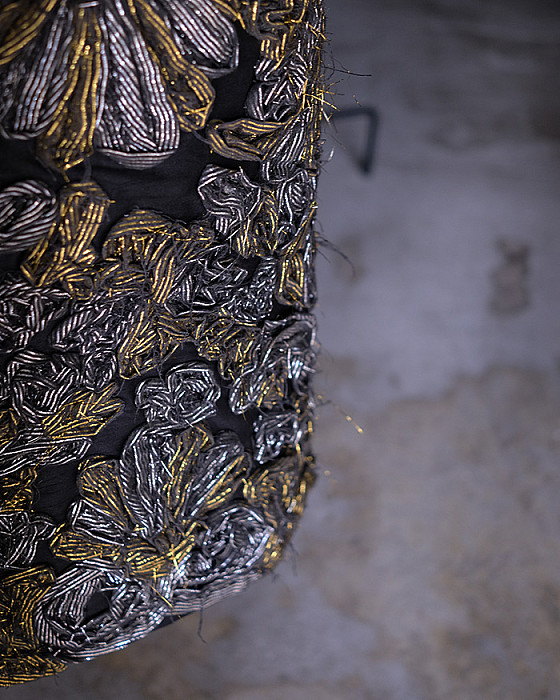 ゴールドとシルバーのストライプの生地テープ状にして、立体的な柄になるようコーディング刺繍しています