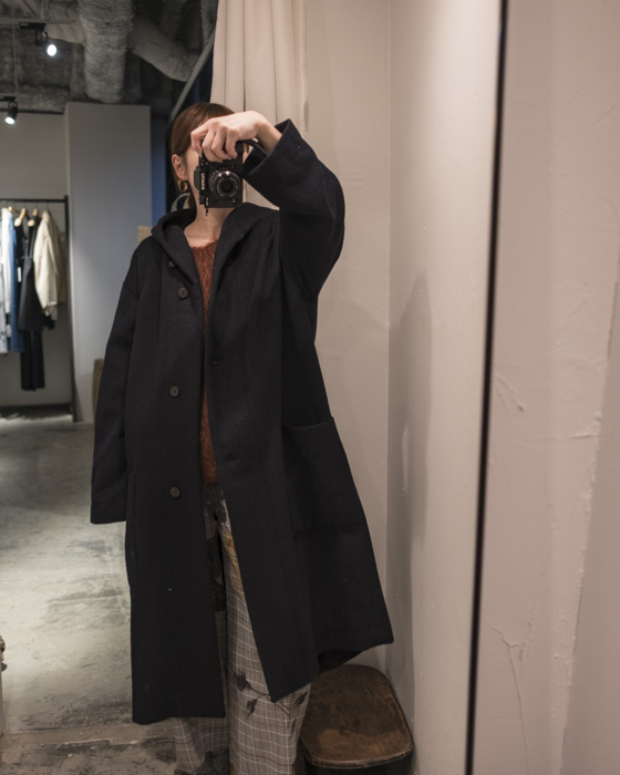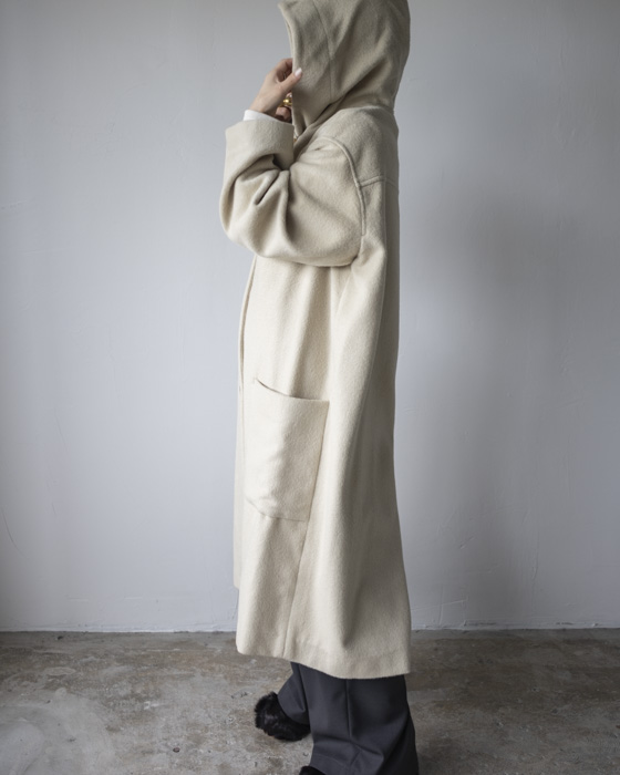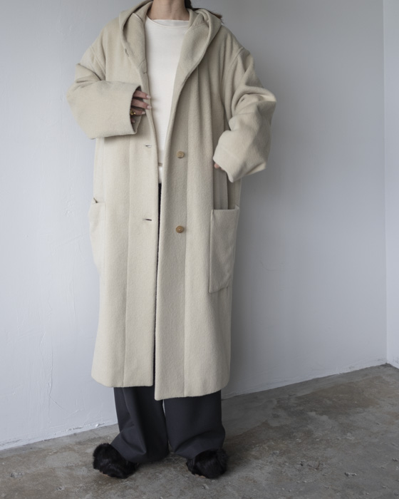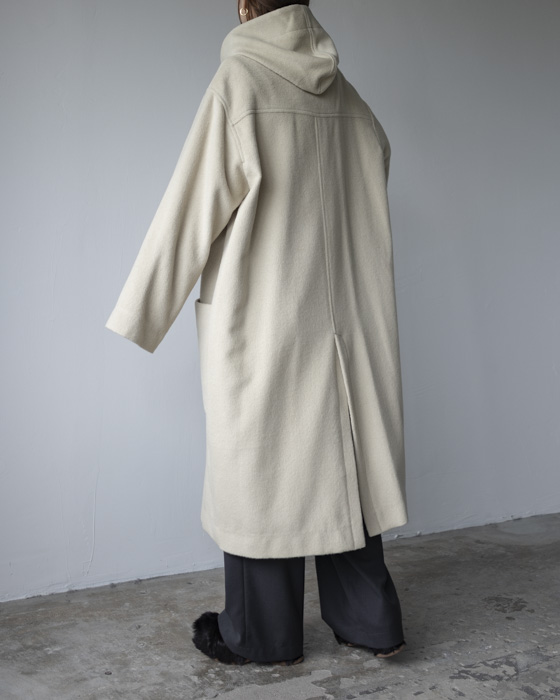 シャギー仕上げで表面に出たアンゴラの毛足が、上品でやわらかな雰囲気を演出。軽くてしなやか、見た目以上に暖かいミドル丈のコートです。首元まで包み込むフードでぬくもりをプラスし、ほどよくカジュアルな印象に。身幅や袖まわりはすっきりと見せながら、インナーを重ねても窮屈にならないシルエットに仕上げています。