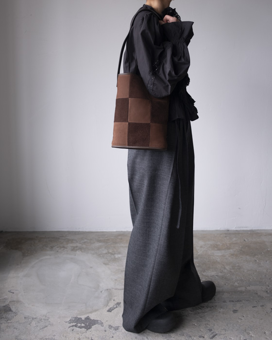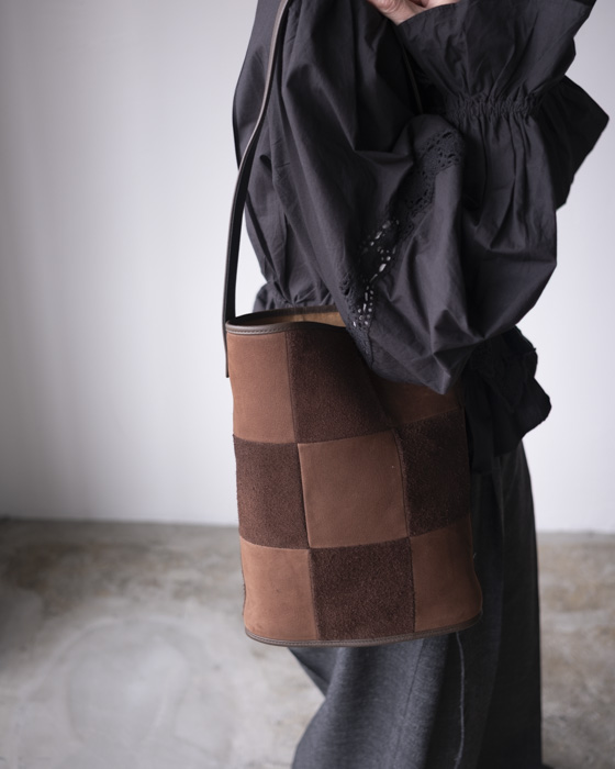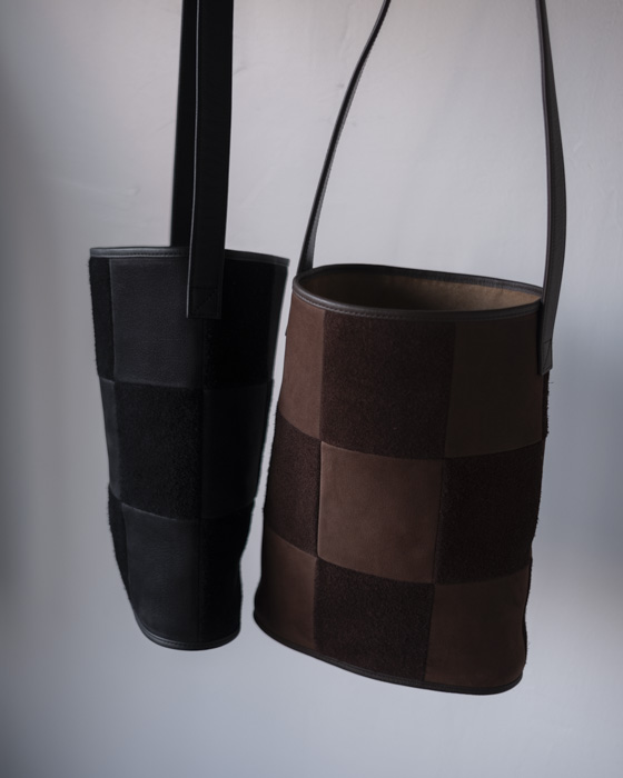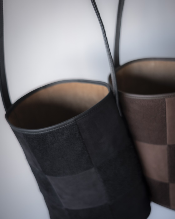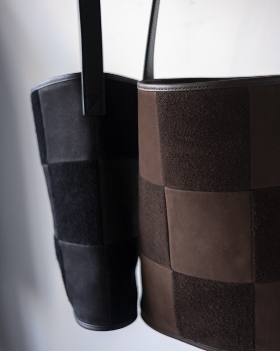 同じ牛革の表面と裏面を組み合わせて仕立てたチェッカーボードパターンが、落ち着いた中にも存在感を放ちます。