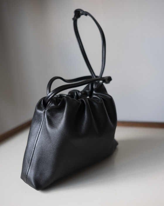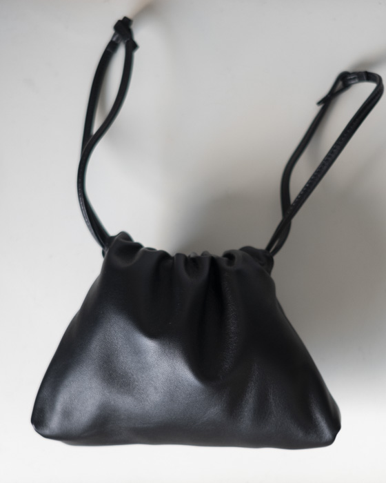小脇に抱えてクラッチバックとしても使うことができます。紐をぎゅっと結んで手持ちにしても、