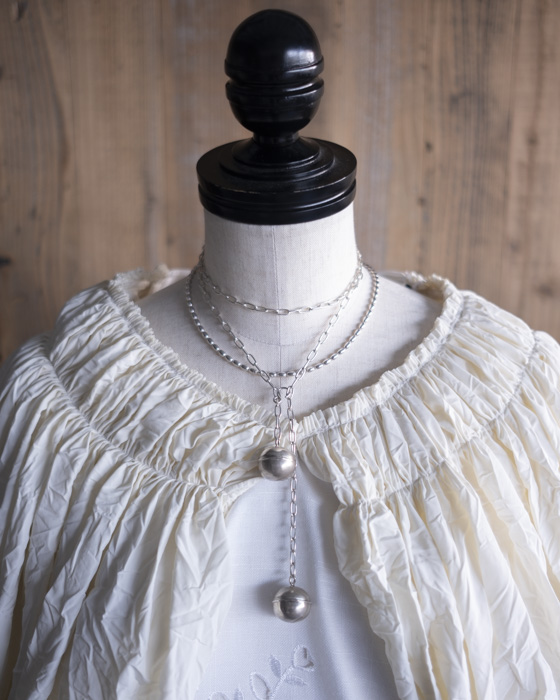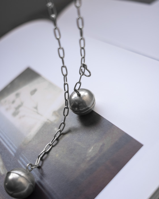 ふたつの鈴の音色が重なるロングネックレス。Sフックがついているので、2連に重ねてチョーカとしても着用可能。