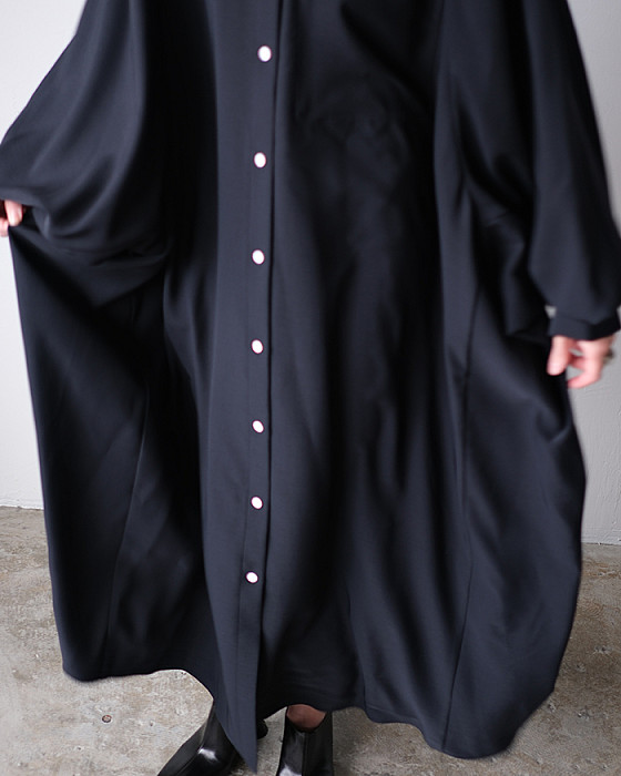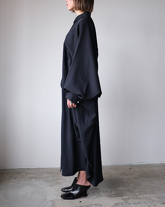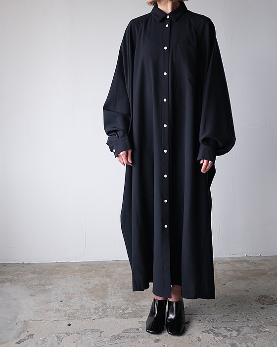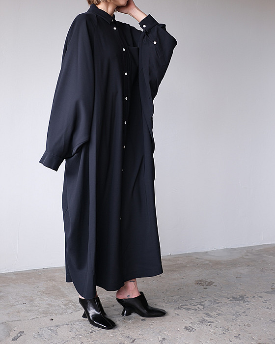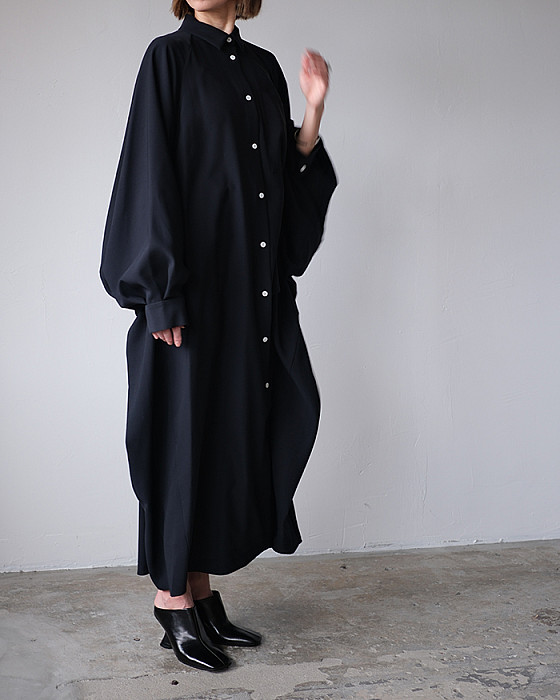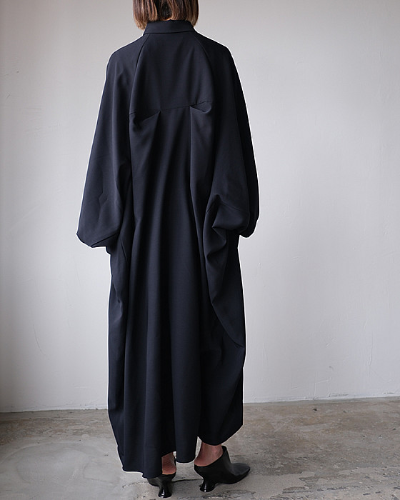 丸みのある肩のラインが特徴的で、前に振った巧みな袖パターンにより着心地とフォルムを両立したドレス。