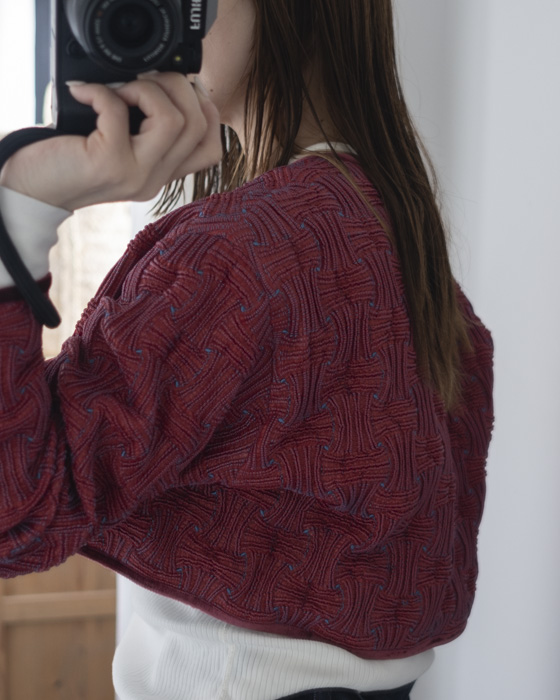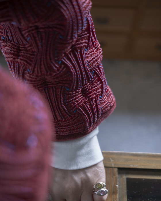 一気に加工します。裏糸に熱収縮糸を使用し、仕上工程で熱を当てることにより独特のシャ―リング感が表現された