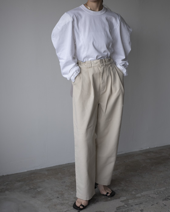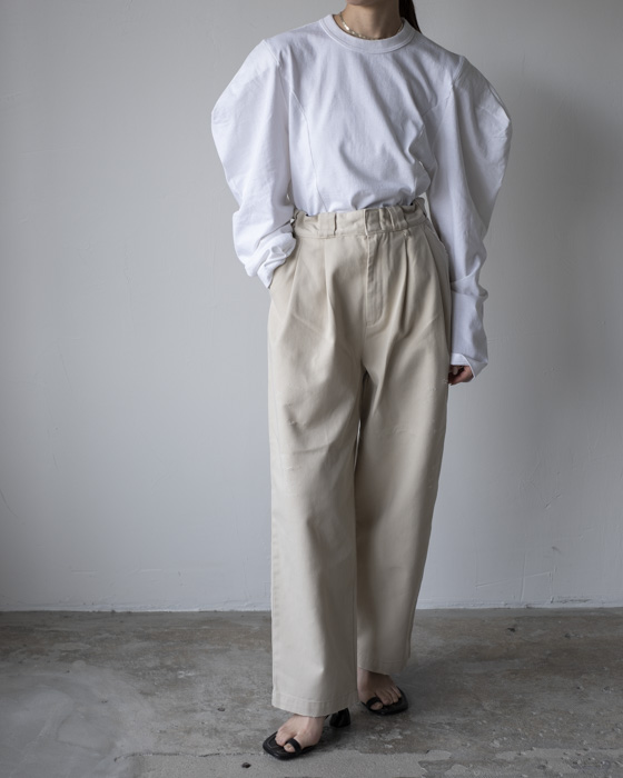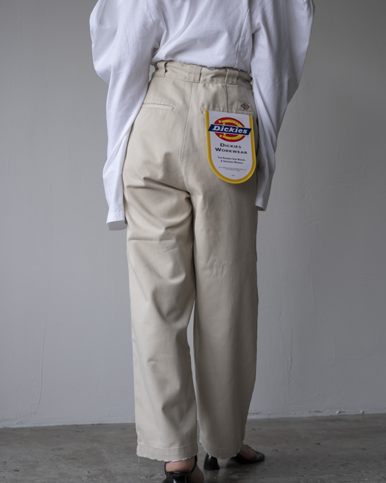 定番DICKIESコラボレーションのパンツ。ドライな質感で雰囲気のあるノンストレッチのリプロダクトTCツイルを使用。ダメージ加工を施し仕上げに洗いもかけ柔らかな風合いに。2タックのラフなシルエットです。キーループがポイント。