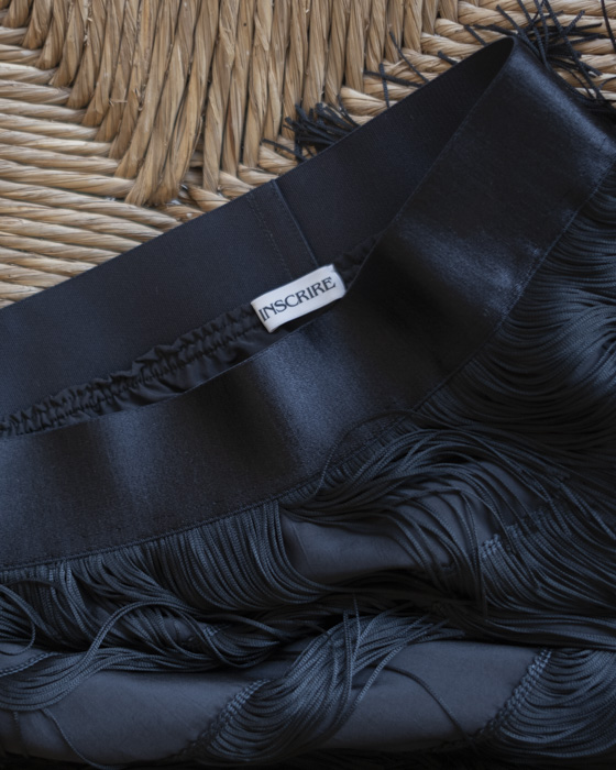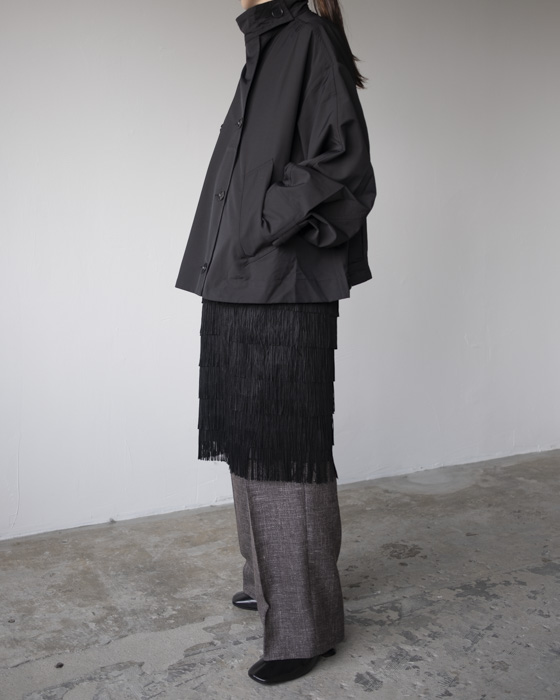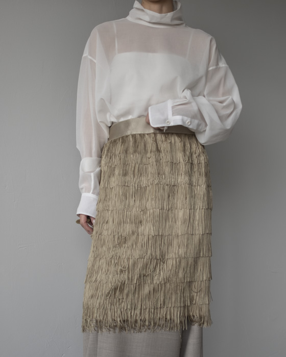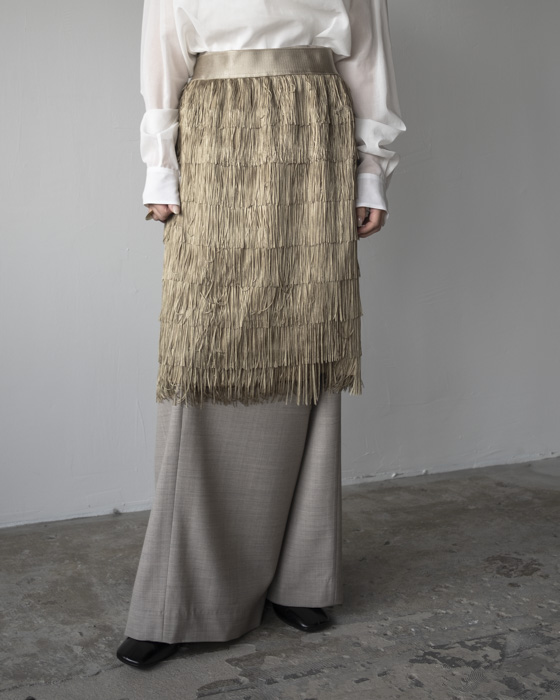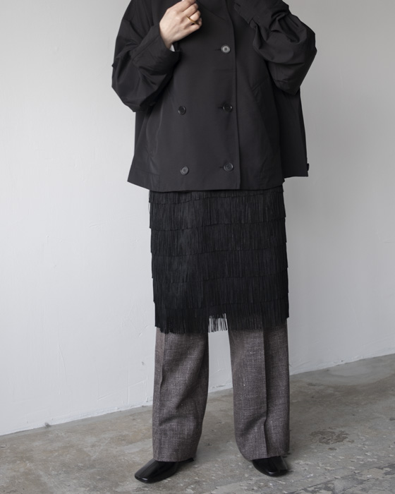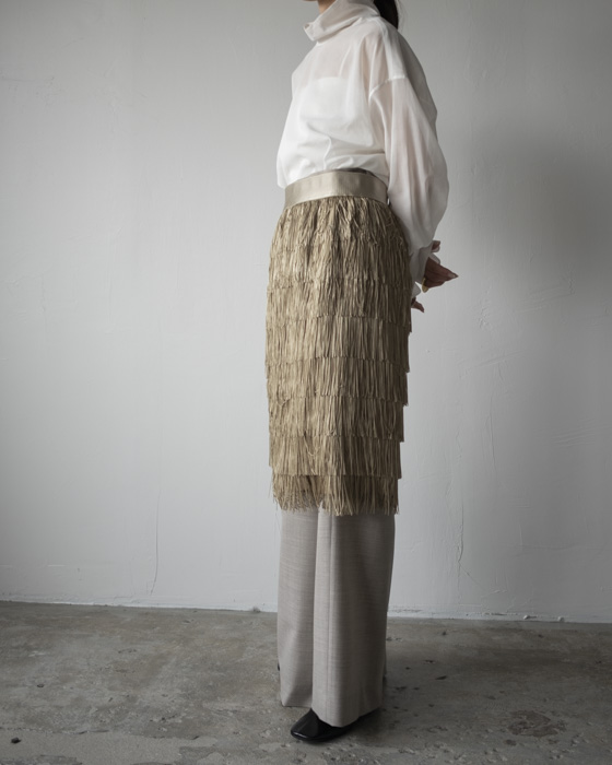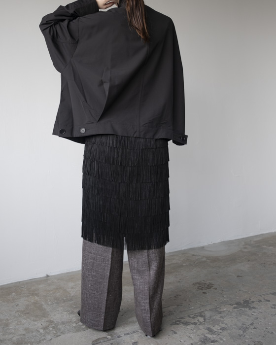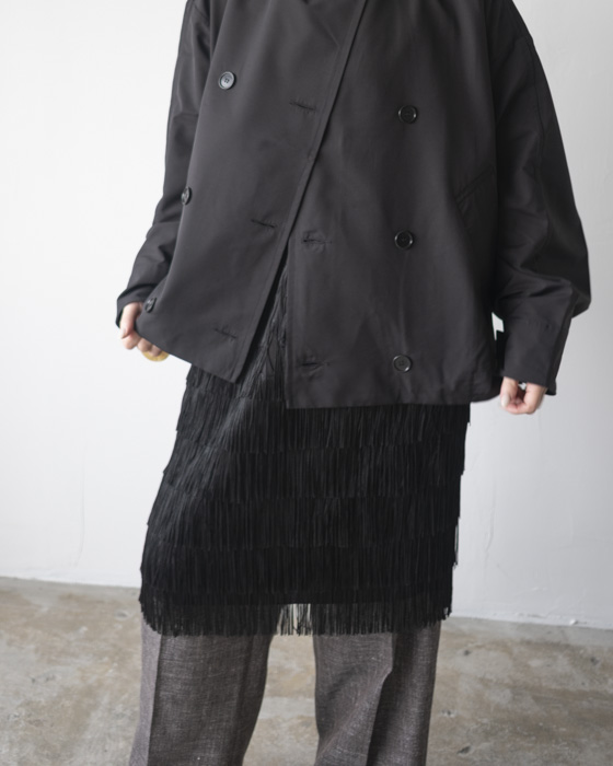 二枚仕立ての奥行きのあるフリンジ使いと、裾のスカラップのようなラインで存在感抜群の一着に仕上がっています。