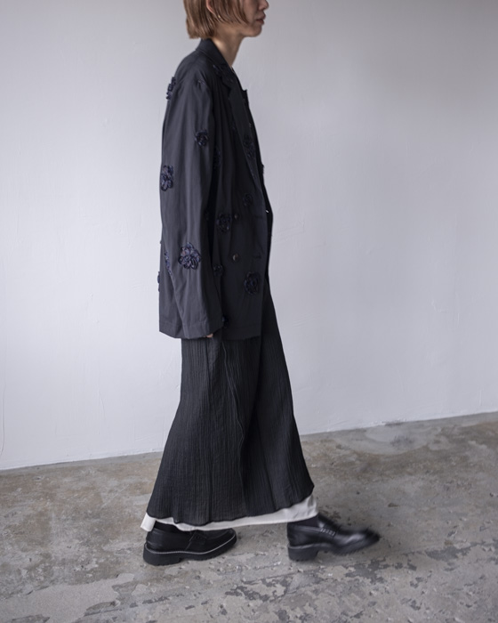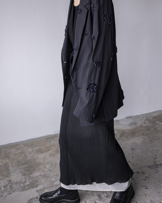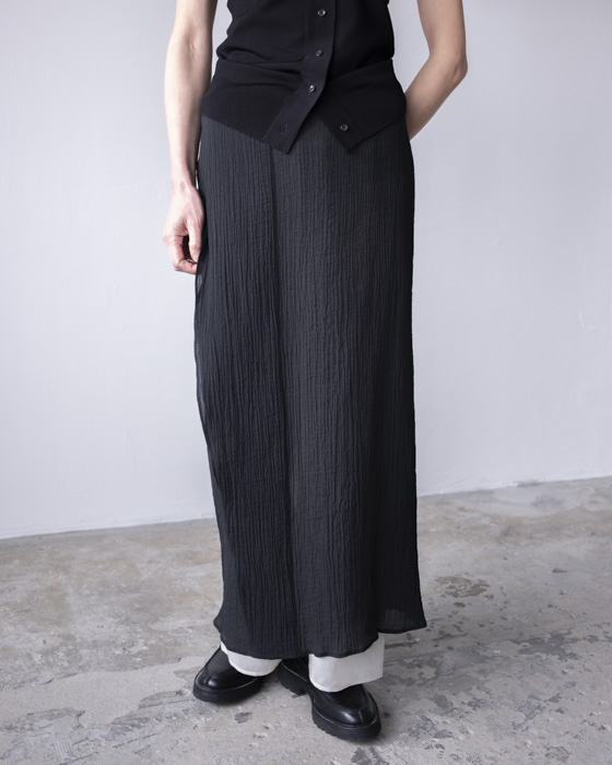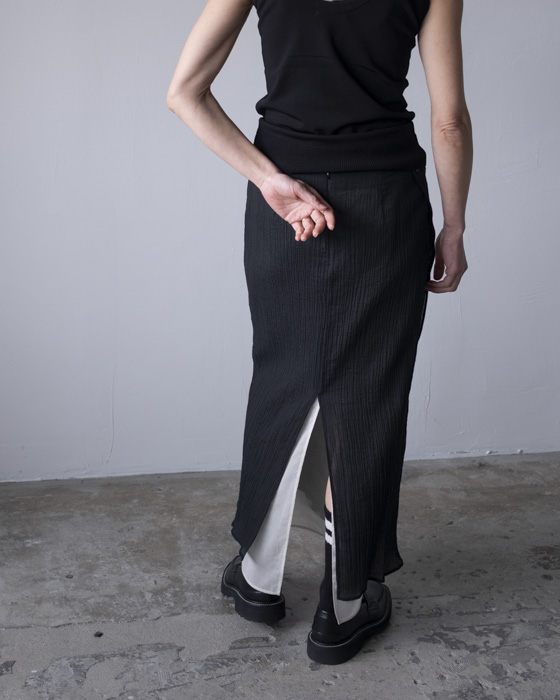 裾とウエストから覗くバイカラーレイヤードデザインのIラインスカート。スカートのフロントは前に落ちてラッフルのようにもなり、脇のボタンで止めるとラップスカートのようにもなります。