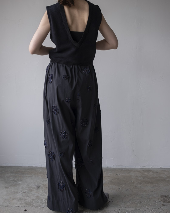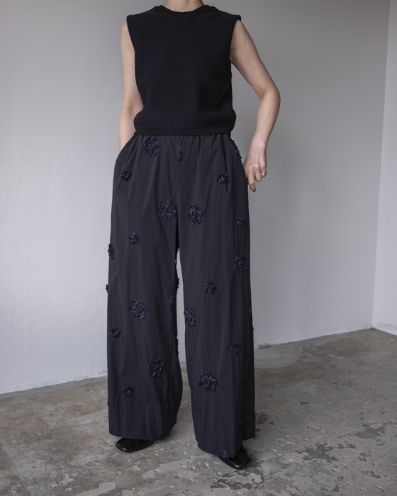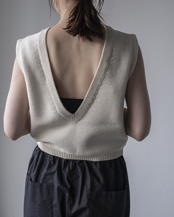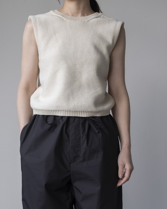 ポリエステル糸を混紡し、程よい膨らみのある表情に編み立てたニットトップ。