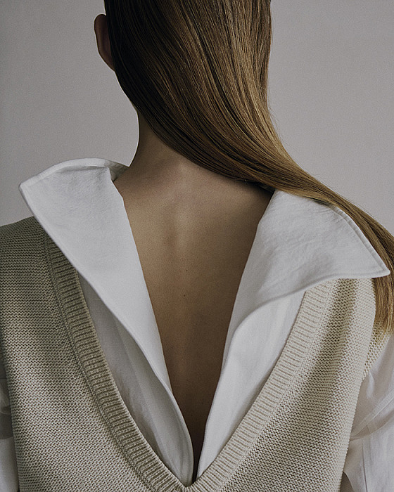 ブラウスやシャツとのレイヤードにも適しており、インナー次第でスタイリングの幅を広げられる一着です