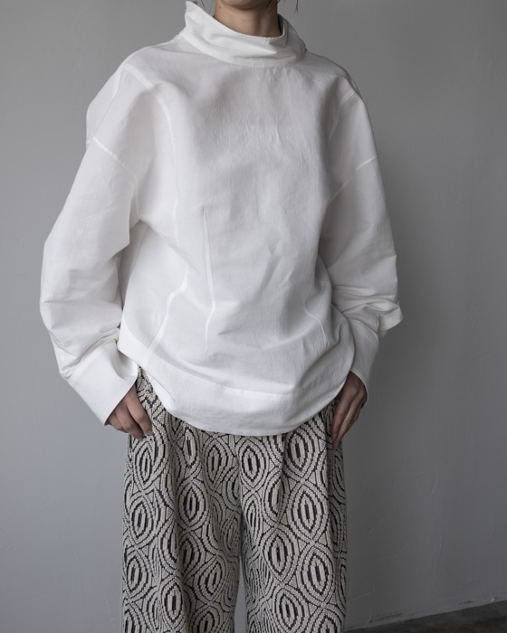 素材の軽やかさと構築的なデザインが、控えめながらも印象的な佇まいを生み出します。背面デザインを活かした一枚着はもちろん、レイヤードスタイルにも対応。着こなしの幅を広げ、スタイリングにさりげない存在感を添える一着です。
