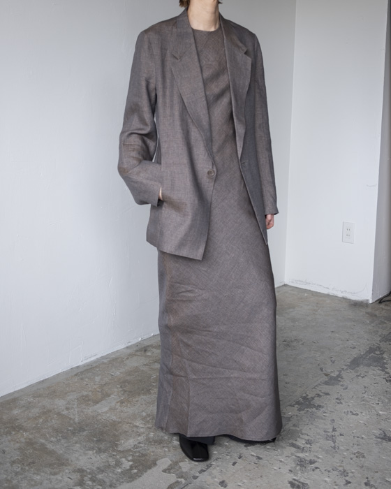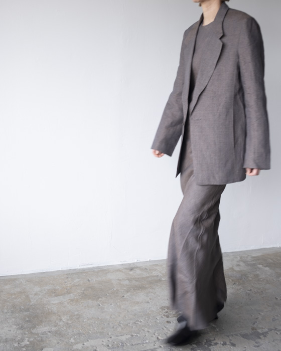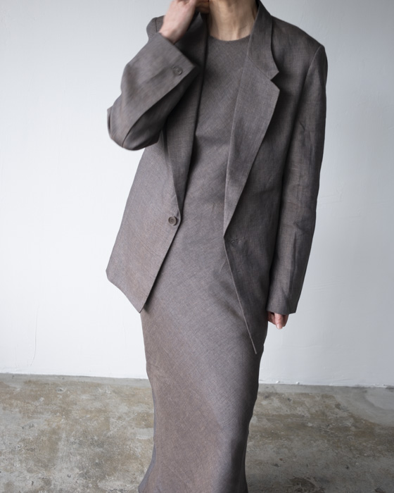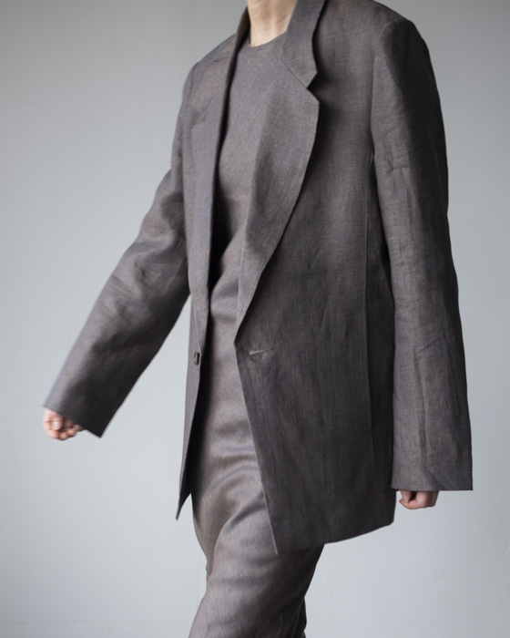 リネン特有のドライな質感と、無駄を削ぎ落としたミニマリズムの融合。空気を含んだような軽やかな着用感ながら、リネン特有の適度なハリが、テーラードとしての凛としたフォルムを美しく保つ。