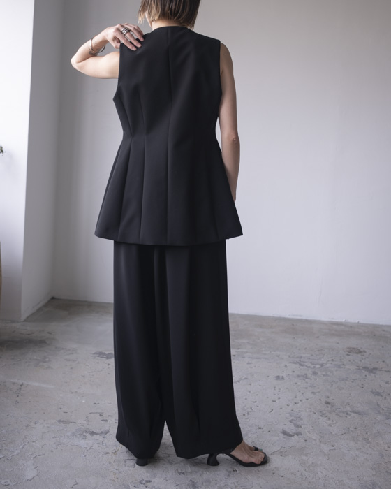 ウエストからの2タックが裾のタックと繋がって縦に美しいラインが出現するワイドパンツ。