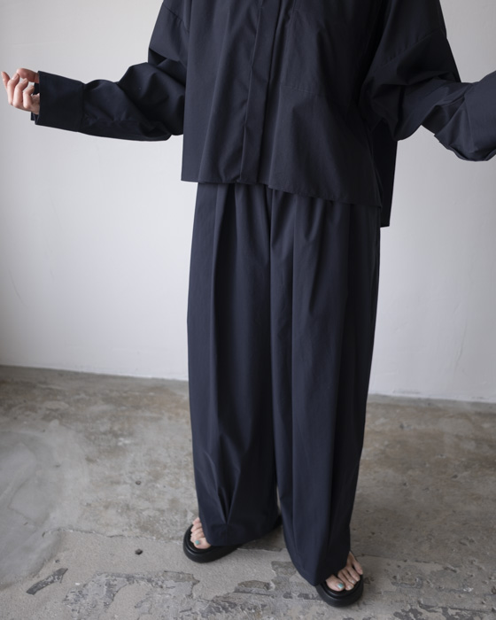 ウエストからの2タックが裾のタックと繋がって縦に美しいラインが出現するワイドパンツ。