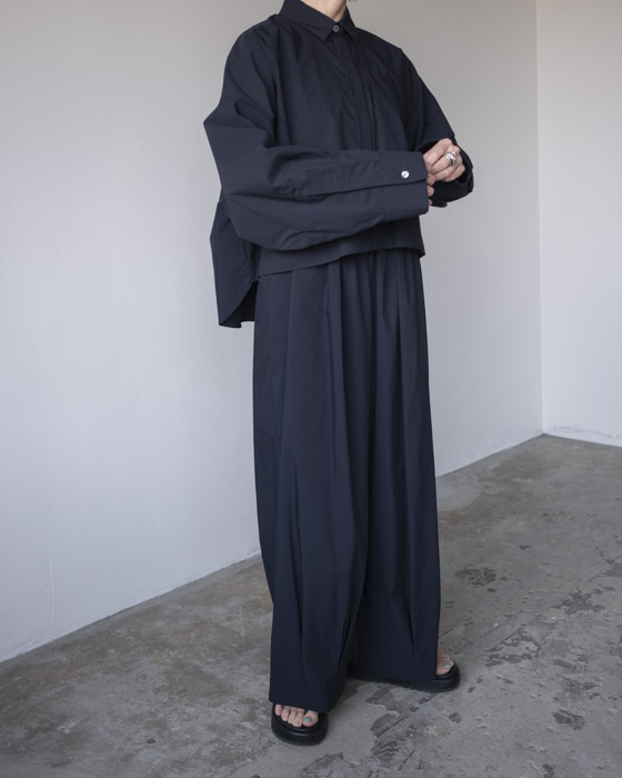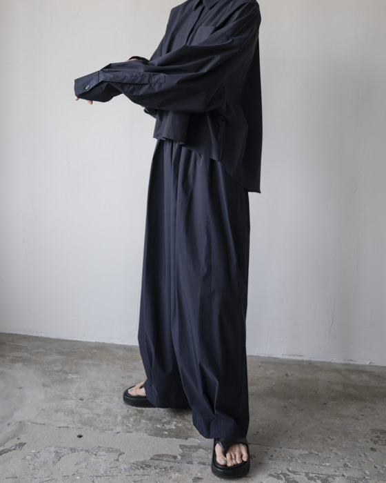 Fabric:前工程、後工程の両方で揉み洗いをし、さらにフィニッシュで特殊樹脂加工を施すことで反発感とトロみを共存させた合繊ライクのタフタ。