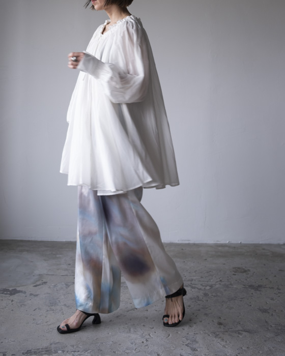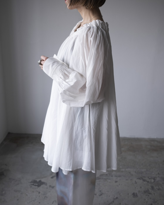 ネックにギャザーとドローストリングを施してあり、ギャザー分量の調整やネックの広さを変えながら、楽しんでいただくことが可能です。