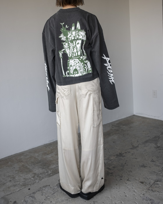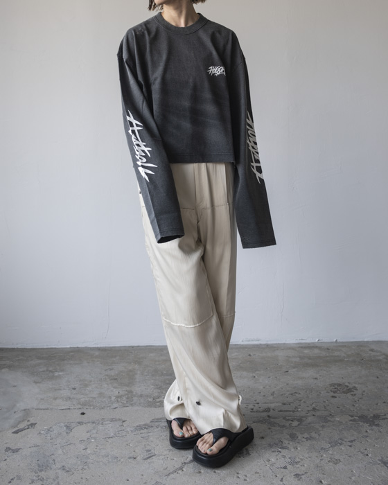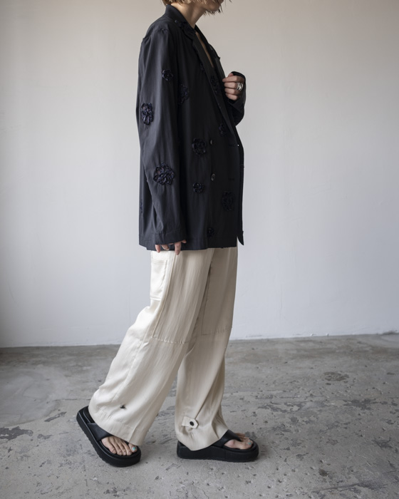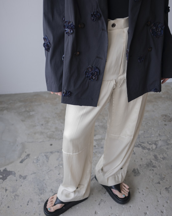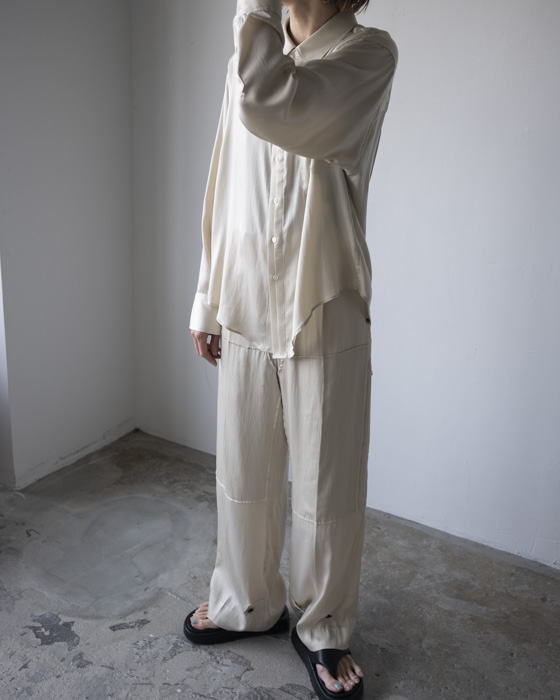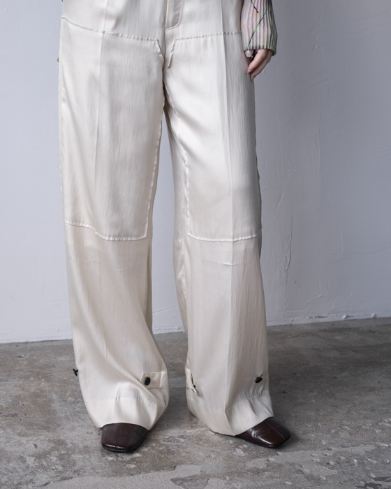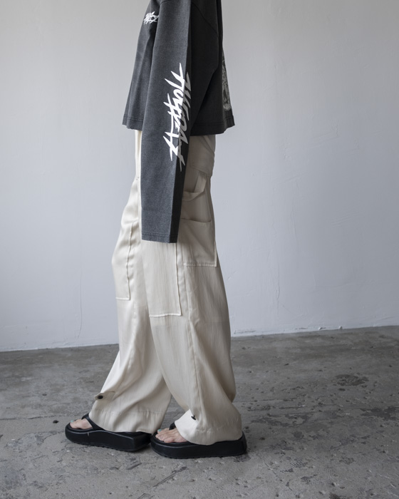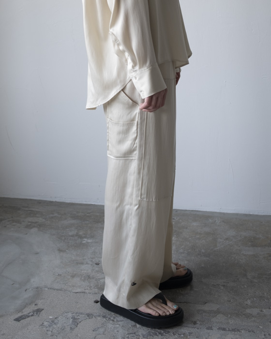 シングルタックのペインターパンツ。ペインターがペインティングをする際に着用されるワークウェアを、品のある素材に落とし込みました。ファブリックは手洗いOKのシルキーサテンキュプラになります。タテ糸にスパンキュプラ、ヨコ糸にナイロンを使用しており、スパンでありながらキュプラの艶感とナチュラルな表情を備えたドレープ素材です。